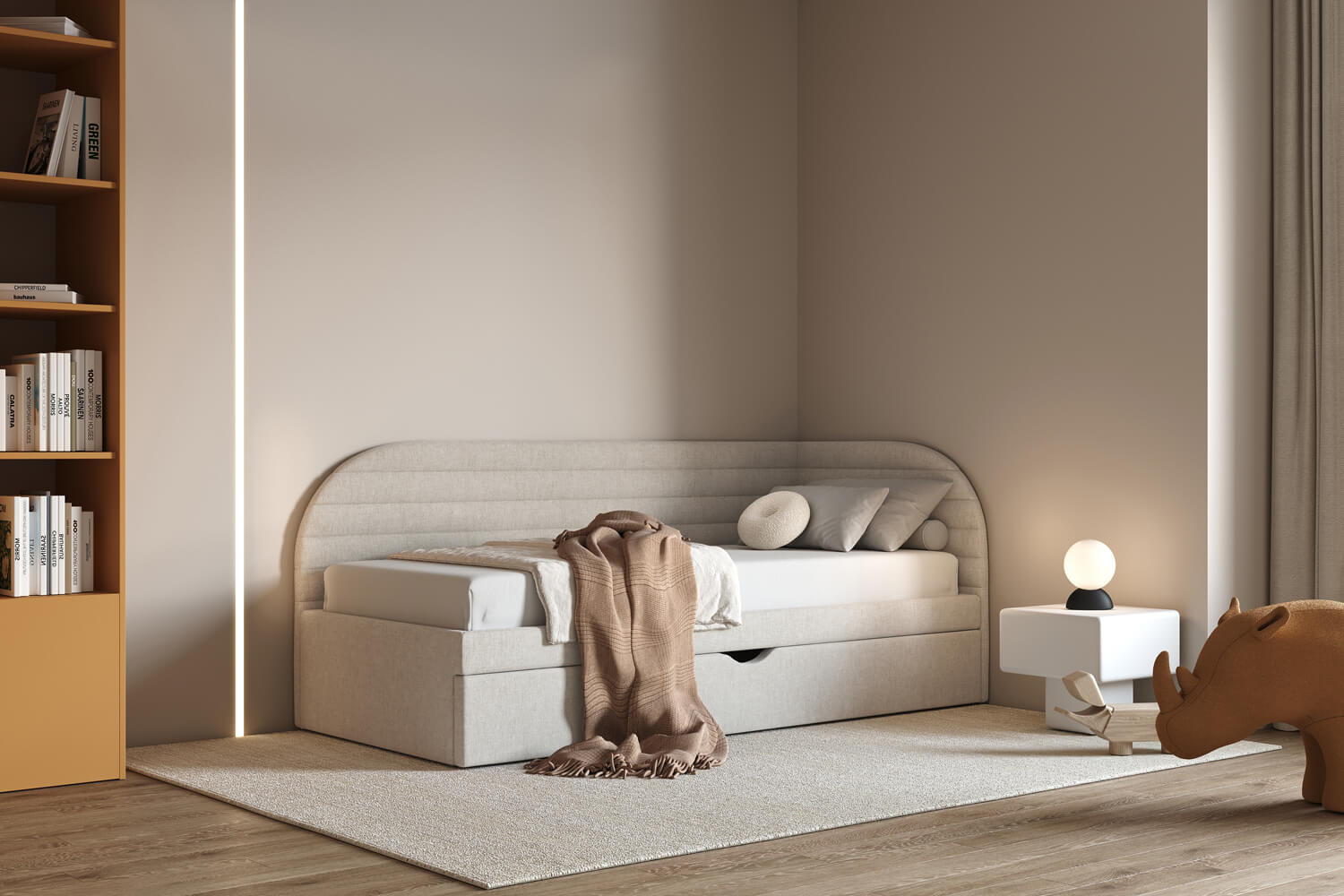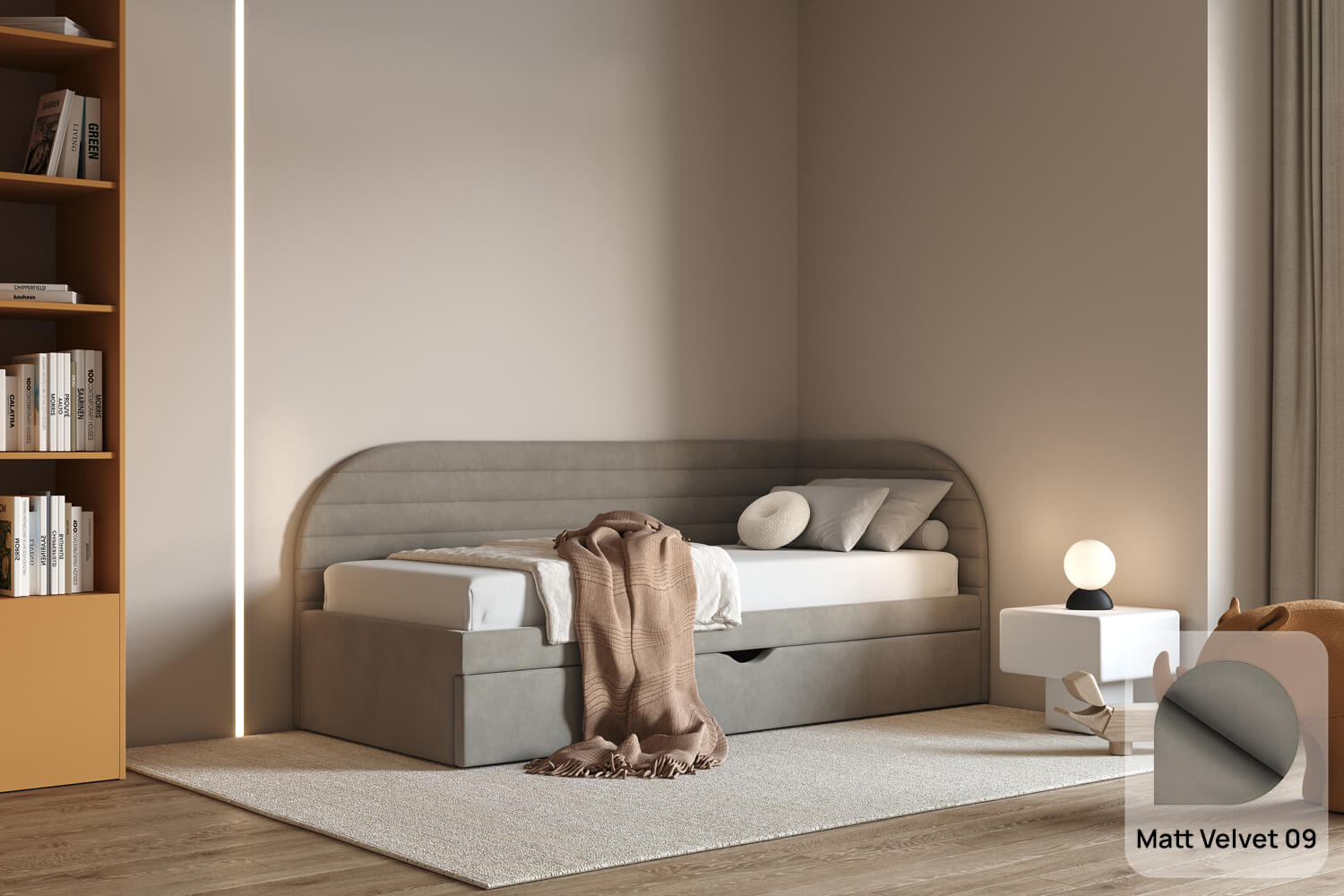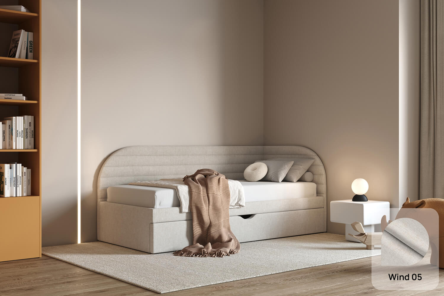 Das Bett Ammo passt perfekt in jede Einrichtung – von modernen bis hin zu klassischen Innenräumen. Sein leichtes Design fügt sich auch in kleinere Räume harmonisch ein.