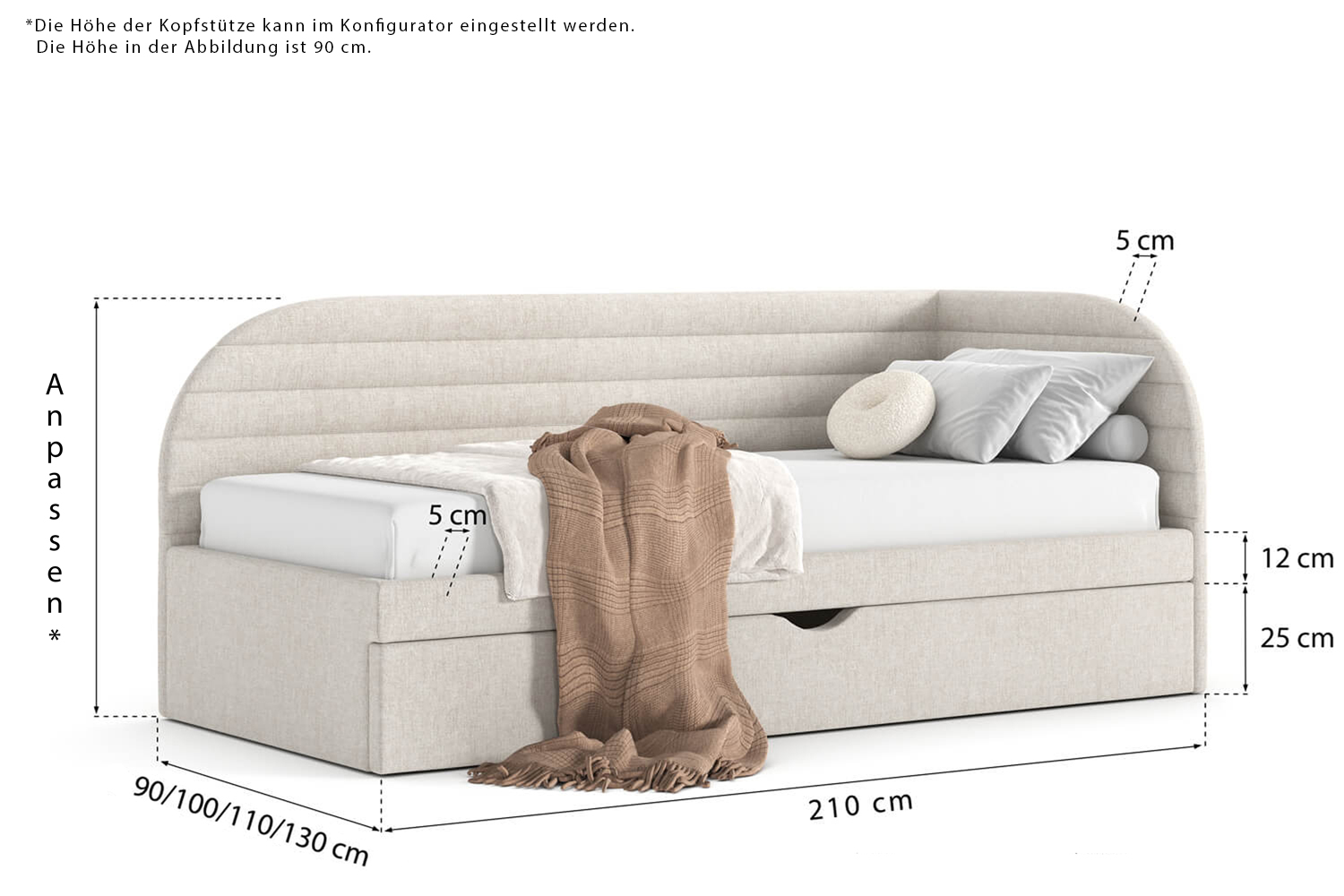 Die angezeigten Maße können durch Auswahl einer anderen Liegefläche im Konfigurator angepasst werden.