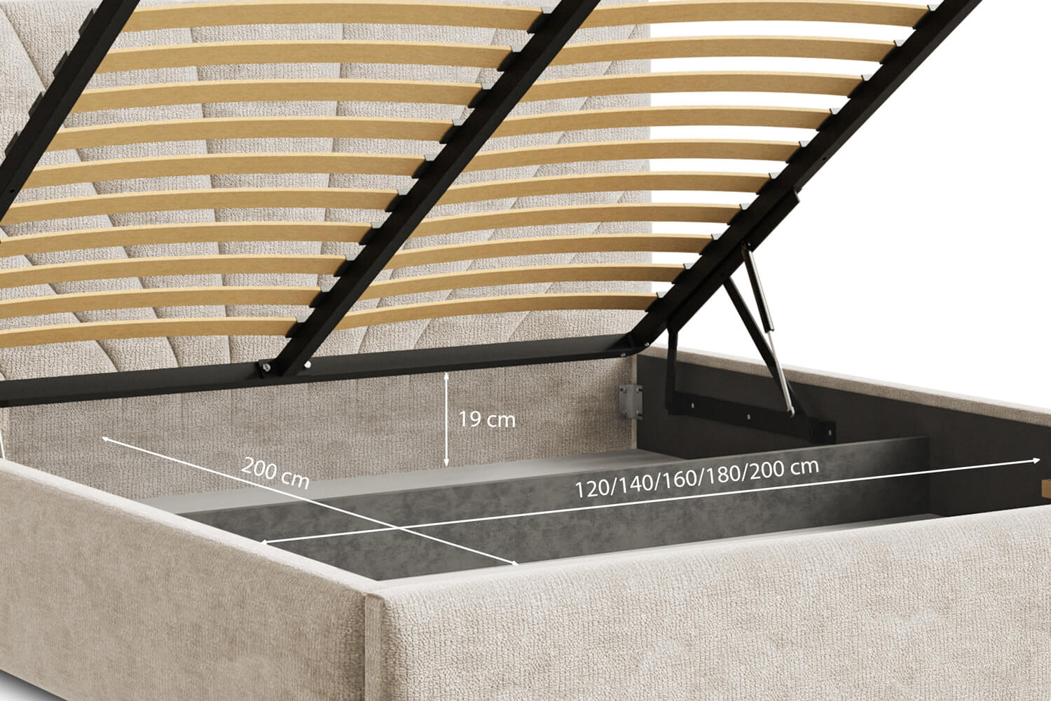 Der funktionale Stauraum für Bettwäsche in unseren Betten bietet zusätzlichen Platz zur Aufbewahrung. Ideal zur Aufbewahrung von Bettwäsche, Kissen und anderen Gegenständen, hilft er, das Schlafzimmer ordentlich zu halten. Hergestellt aus robusten Materialien, ist er einfach zu bedienen und bietet hohen Komfort.