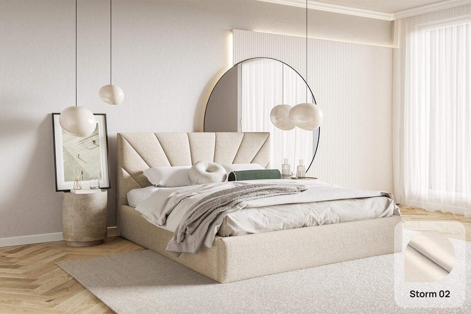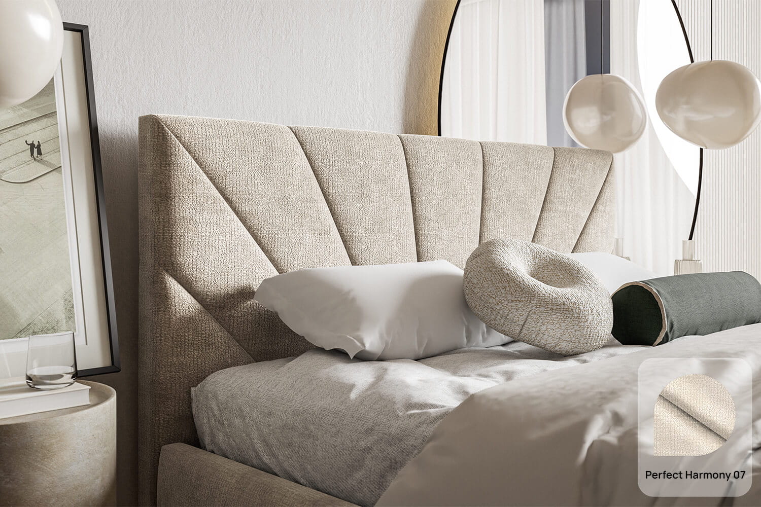 Das Aurora-Bettmodell von MyBed begeistert durch sein einzigartiges Design, das dem Schlafzimmer eine unverwechselbare Atmosphäre verleiht! Die glatten Seiten des Bettes betonen seinen minimalistischen Charakter und verleihen dem Raum Eleganz und Ruhe. Das größte Highlight ist jedoch das Kopfteil, an dem schräg verlaufende Nähte einen Sonneneffekt erzeugen, der dem Raum Wärme und Glanz verleiht. Diese subtile Dekoration zieht die Blicke auf sich und macht dieses Modell zum zentralen Element jeder Raumgestaltung. Wenn du also einen Hauch von originellem Stil in dein Zuhause bringen möchtest, ist das Bett Aurora die ideale Wahl.