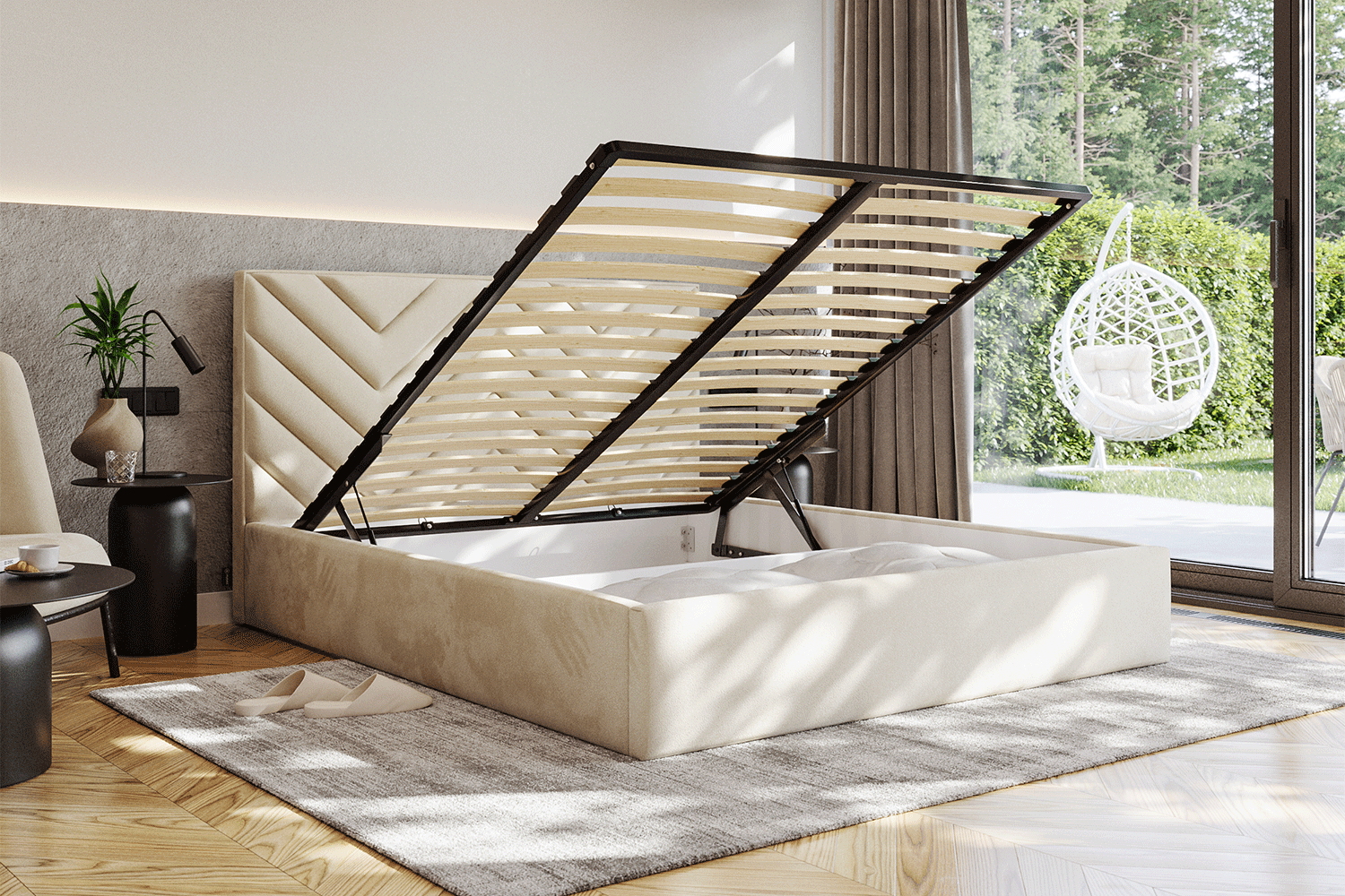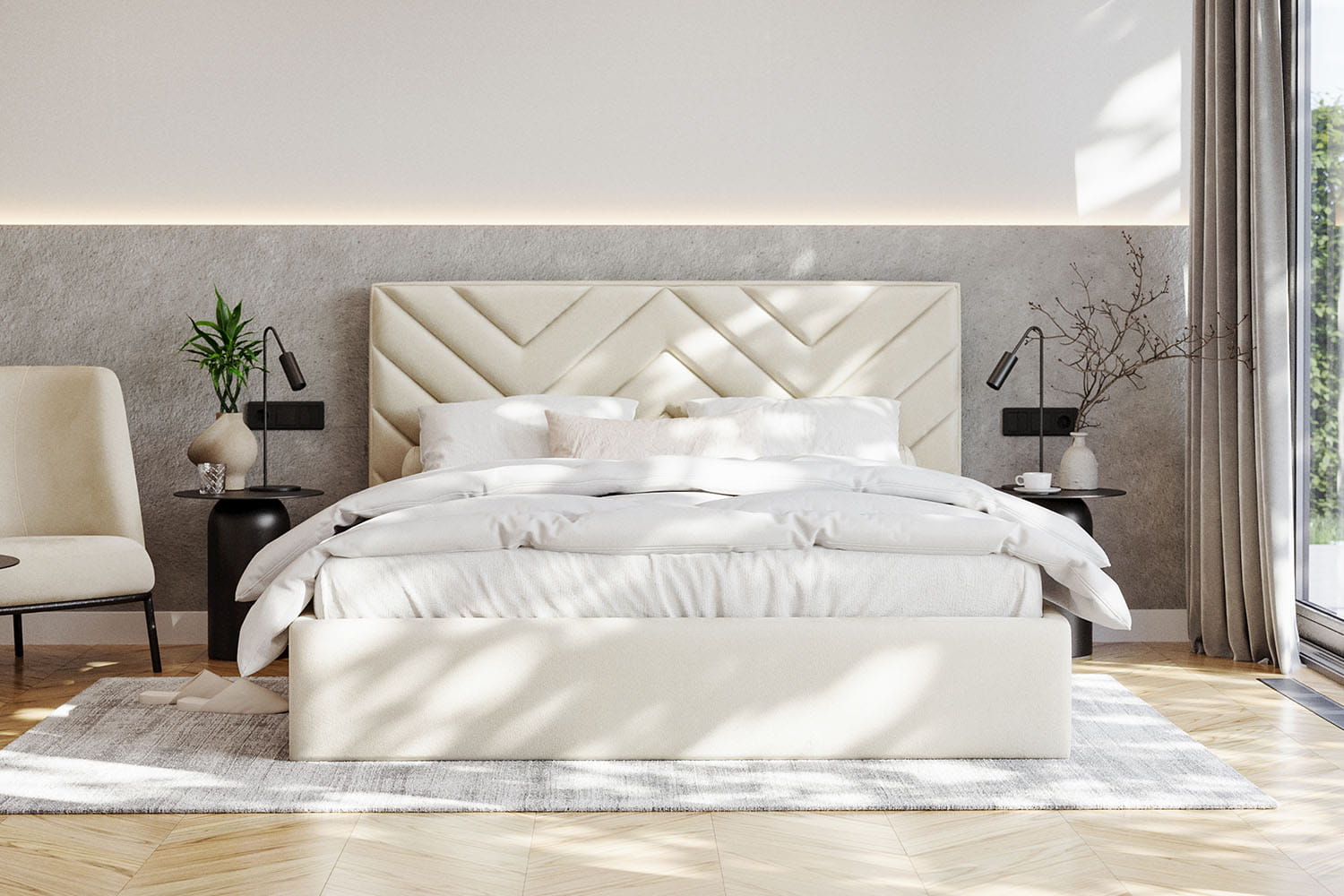 Das Chevron Bett ist eine ausgezeichnete Wahl sowohl für moderne als auch klassische Räume. Seine einzigartige Form und sein Design ziehen alle Blicke auf sich und verleihen Charakter.