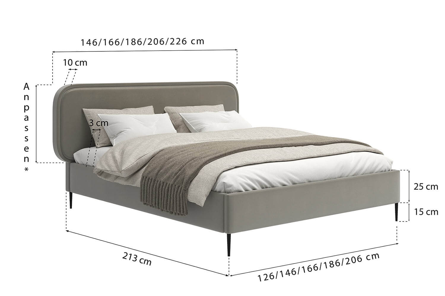 Die angezeigten Abmessungen kannst du ändern, indem du eine andere Schlafoberfläche im Konfigurator auswählst