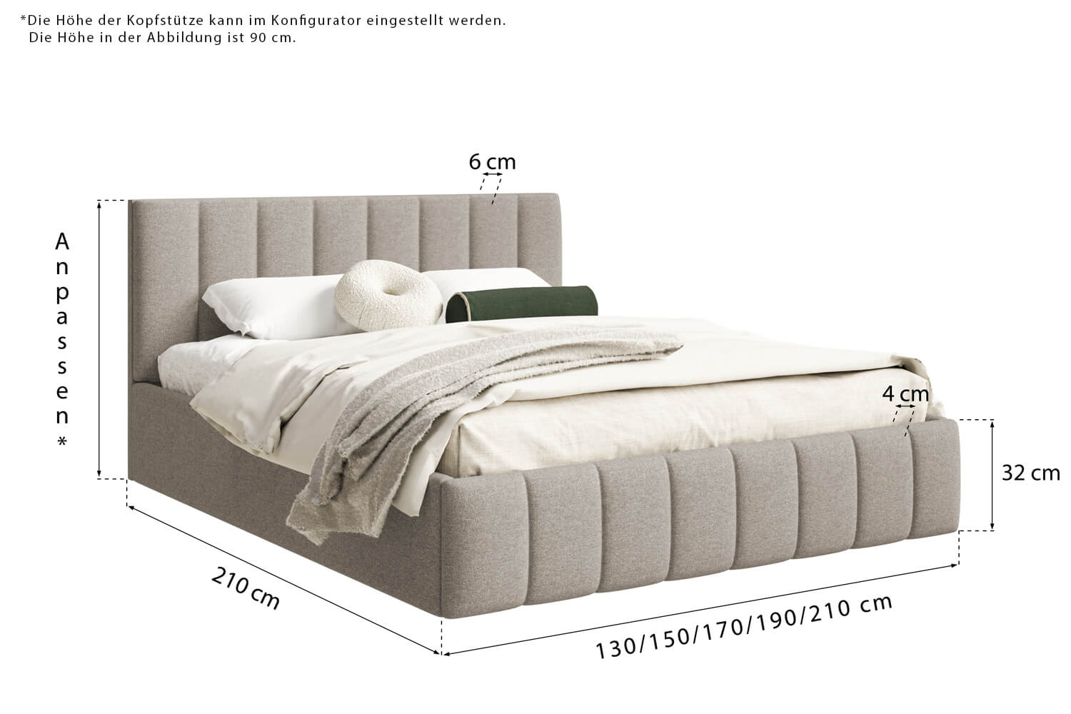Interessiert Sie eine andere Farbe des Bezugsstoffs oder möchten Sie weitere Details ändern? Bei MyBed können Sie jedes Bett beliebig umgestalten und so einzigartige Kombinationen kreieren! Wir stellen Ihnen einen intuitiven Konfigurator zur Verfügung, mit dem Sie Ihre eigenen Ausstattungsoptionen und mehr auswählen können. Wählen Sie frei aus zahlreichen Schlafoberflächen, Farben und Texturen der Stoffe, Arten von Lattenrosten, dekorativen Füßen sowie der Höhe des Kopfteils. Sie entscheiden auch selbst, ob Sie ein Bett mit Bettwäschebehälter oder ohne wünschen. Sie können auch ein komplettes Bett mit Matratze bestellen!
