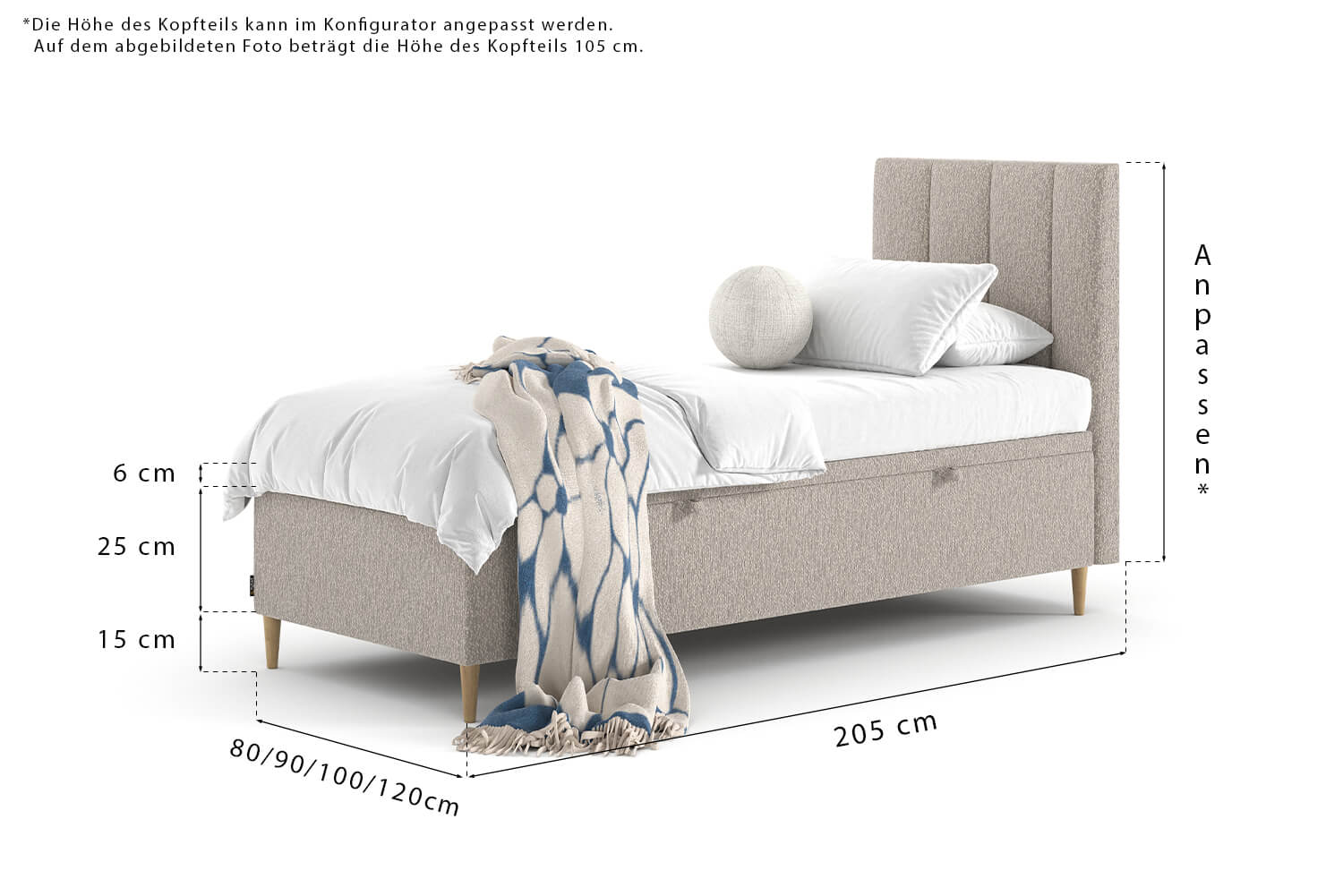 Die angezeigten Maße können Sie ändern, indem Sie eine andere Liegefläche im Konfigurator auswählen