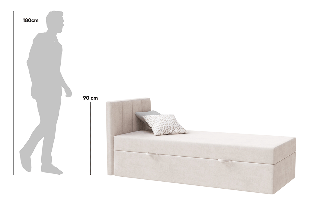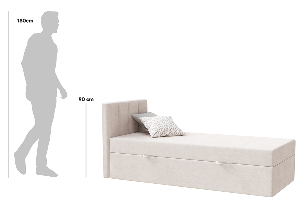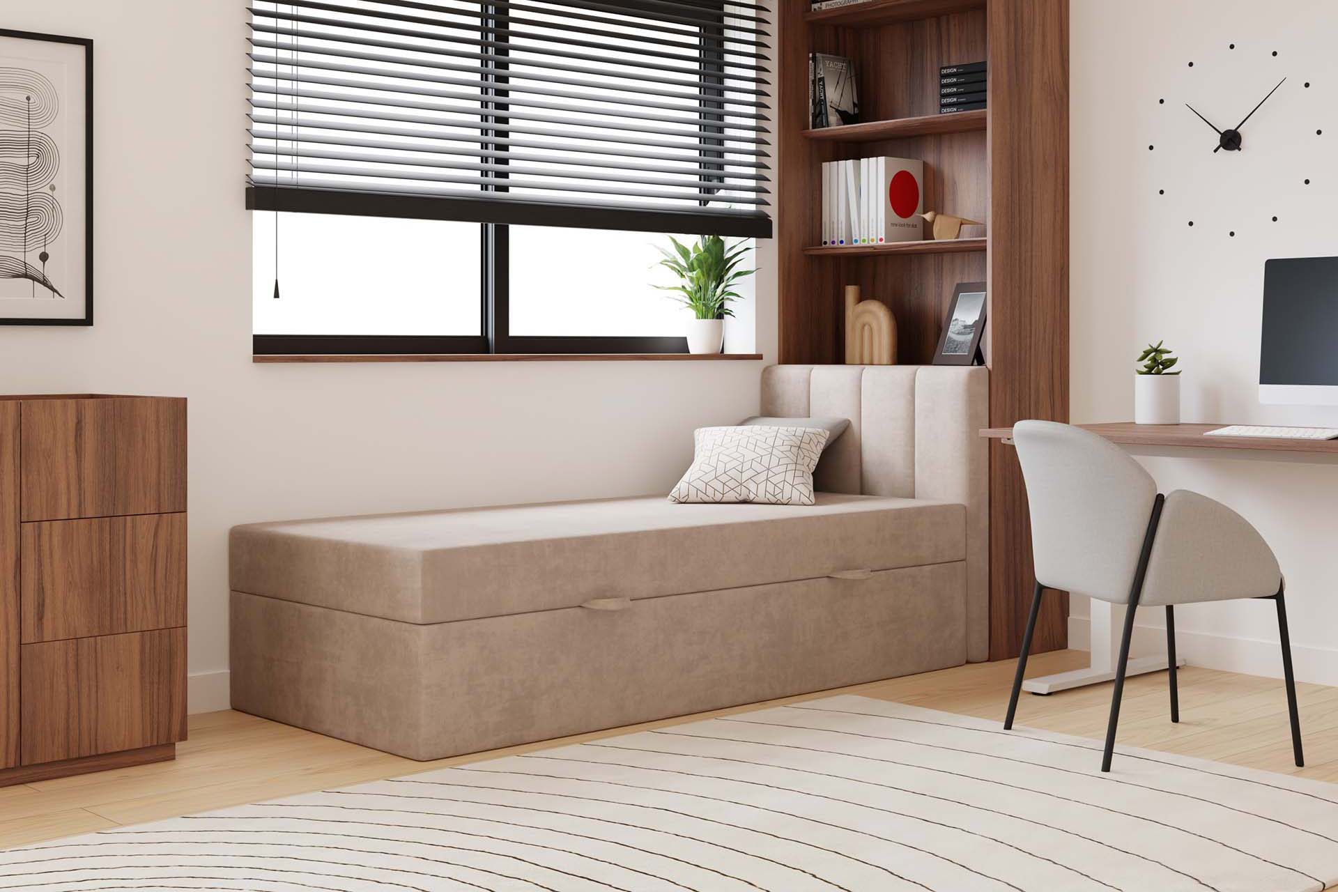 Das kontinentale Einzelbett Kaja von MyBed.de ist die perfekte Lösung für alle, die Komfort und Funktionalität schätzen. Das flauschige Kopfteil mit vertikalen Nahtlinien verleiht dem Schlafzimmer Gemütlichkeit und Eleganz, während es gleichzeitig eine bequeme Rückenlehne zum Entspannen bietet. Die glatte Form des Bettes sorgt dafür, dass es sich ideal mit verschiedenen Einrichtungsstilen kombinieren lässt, von modern bis klassisch. Zudem ermöglicht ein praktischer Bettkasten eine effiziente Raumnutzung und hilft, Ordnung zu halten. Das Bett Kaja ist eine Wahl, die Ästhetik mit praktischen Lösungen vereint!
