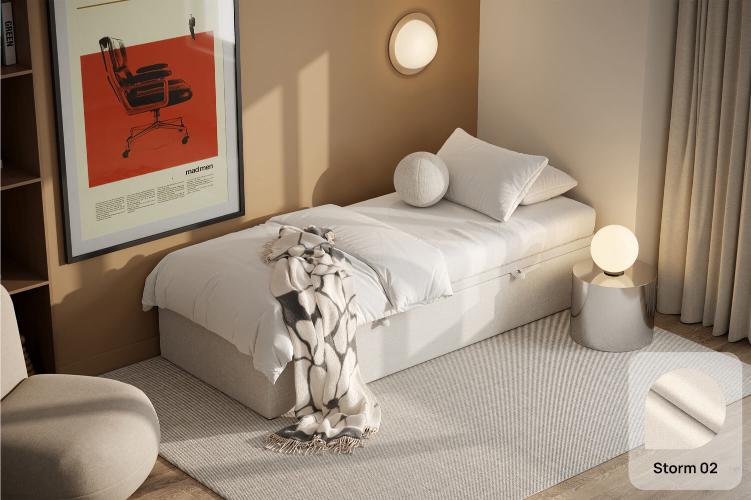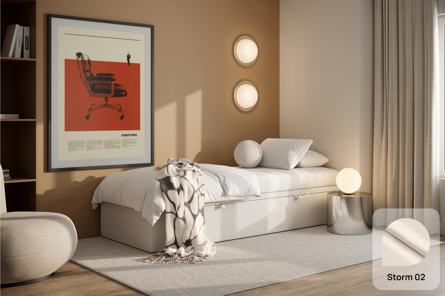 Gestalte dein Bett perfekt nach deinen Bedürfnissen. Wir bieten die Möglichkeit einer vollständigen Personalisierung – von der Größenwahl über die Auswahl des Bezugsstoffs bis hin zu zusätzlichen Funktionen wie einem Bettwäschebehälter oder einem Kopfteil. So kannst du ein Bett entwerfen, das ideal zu deinem Interieur und Lebensstil passt.