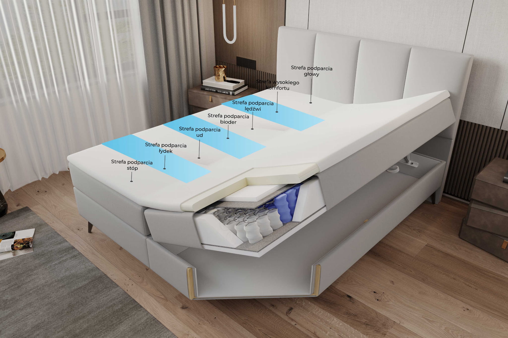 Der funktionale Bettwäschebehälter in unseren Betten bietet zusätzlichen Stauraum. Ideal zur Aufbewahrung von Bettwäsche, Kissen und anderen Gegenständen, hilft er, Ordnung im Schlafzimmer zu halten. Hergestellt aus robusten Materialien, ist er leicht zu bedienen und sorgt für Komfort.