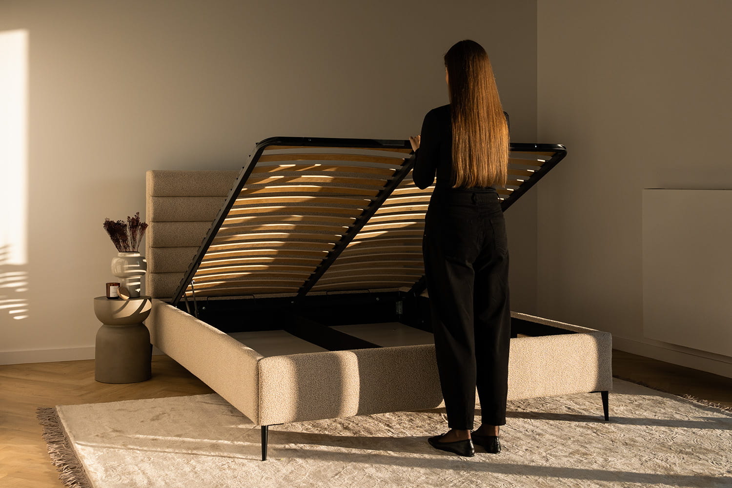 Der praktische Bettkasten in unseren Betten bietet zusätzlichen Stauraum. Ideal für Bettwäsche, Kissen und andere Gegenstände – für ein aufgeräumtes Schlafzimmer. Hergestellt aus langlebigen Materialien, ist er leicht zu bedienen und besonders benutzerfreundlich.