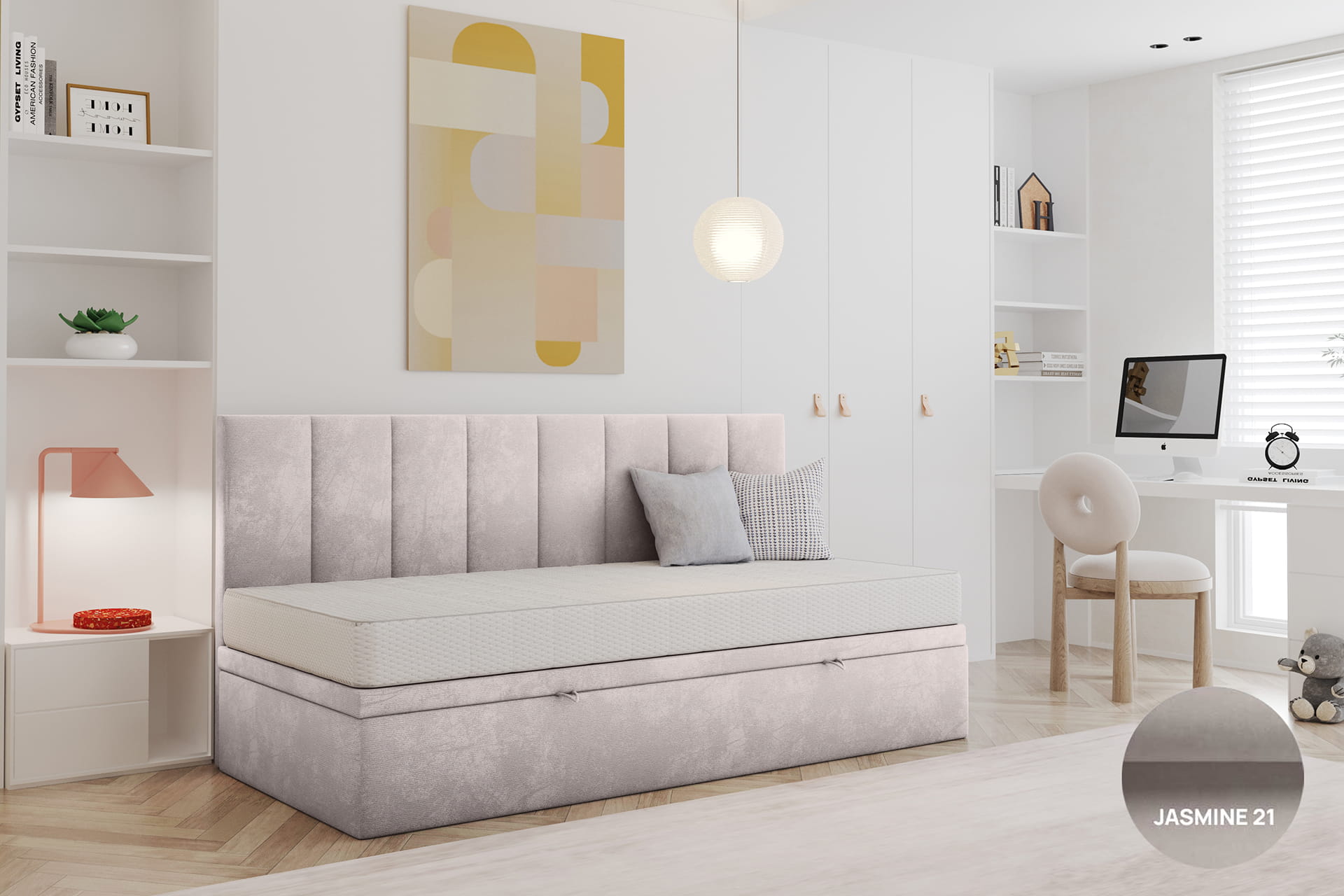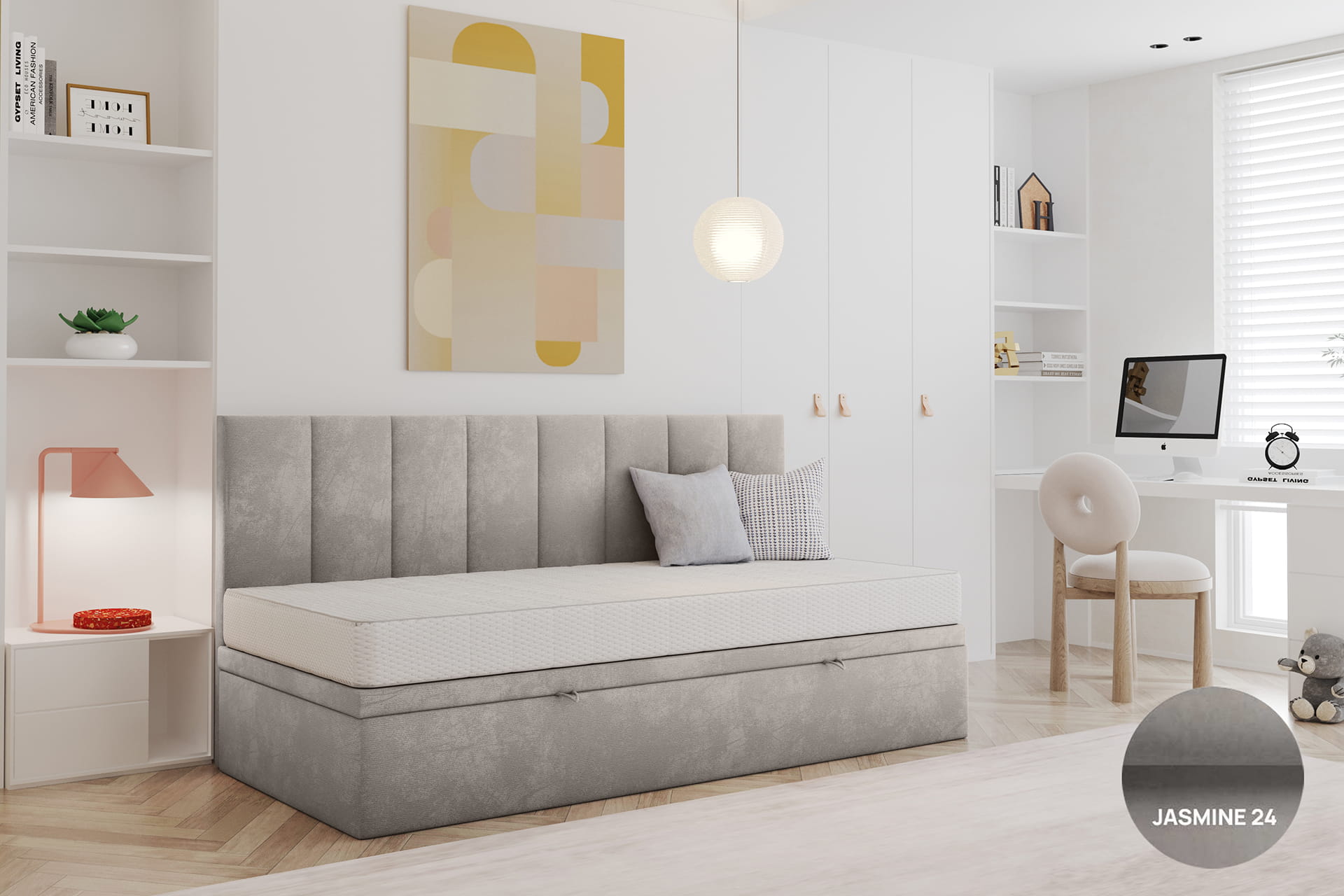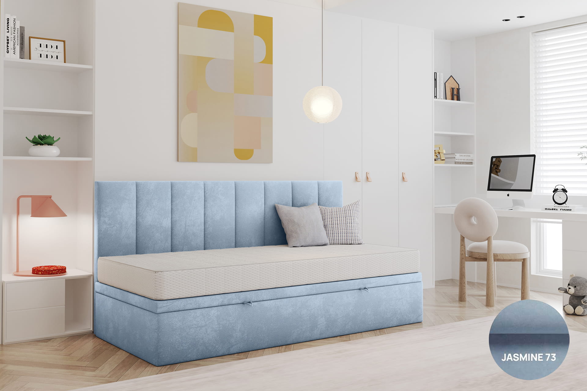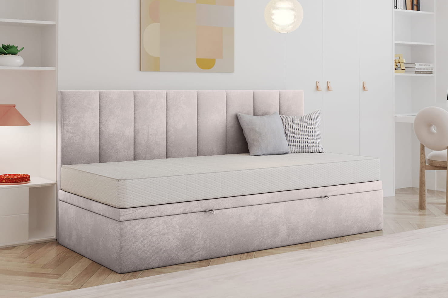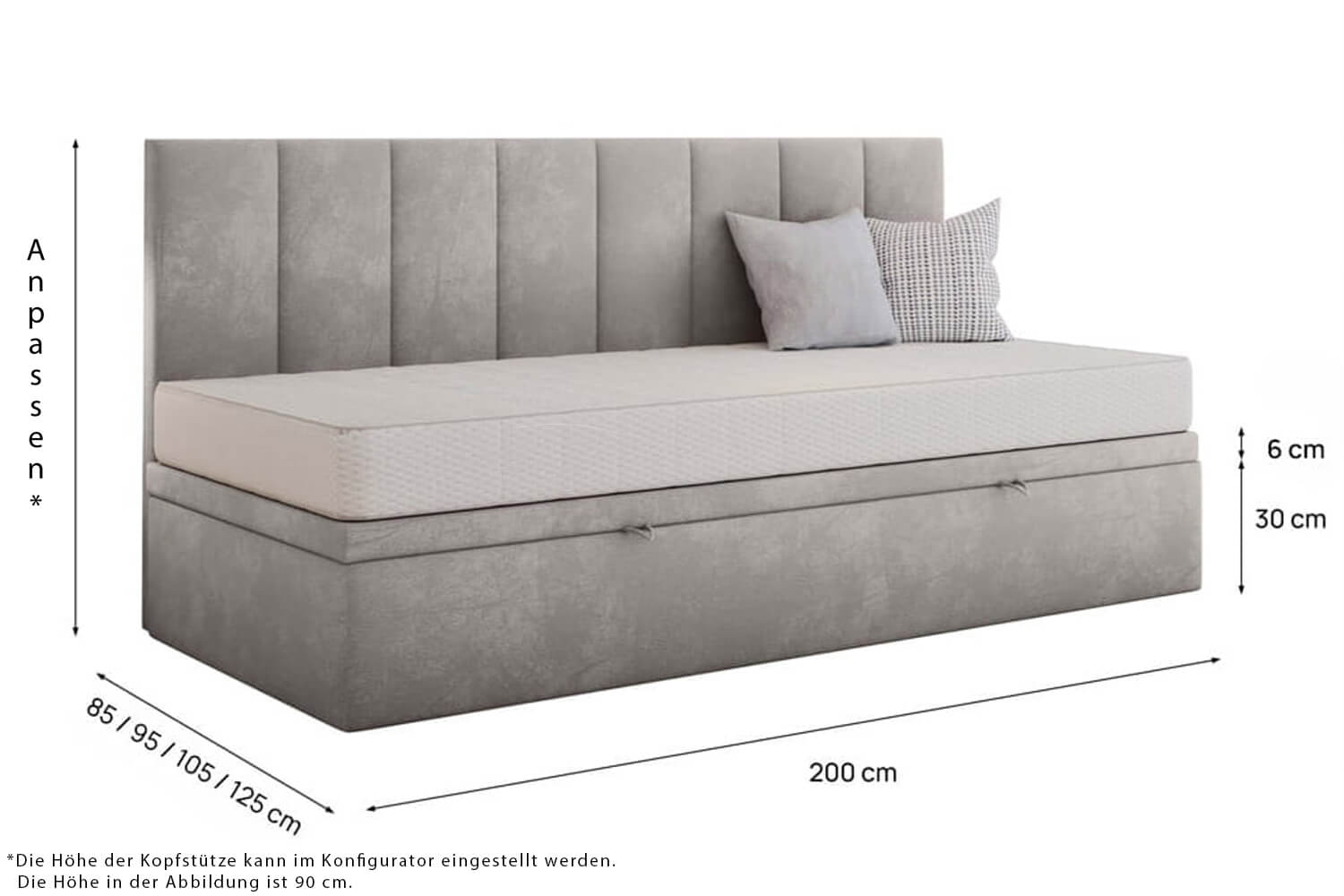 Gestalte dein Bett perfekt nach deinen Bedürfnissen. Wir bieten die Möglichkeit einer vollständigen Personalisierung – von der Größenwahl über die Auswahl des Bezugsstoffs bis hin zu zusätzlichen Funktionen wie einem Bettwäschebehälter oder einem Kopfteil. So kannst du ein Bett entwerfen, das ideal zu deinem Interieur und Lebensstil passt.