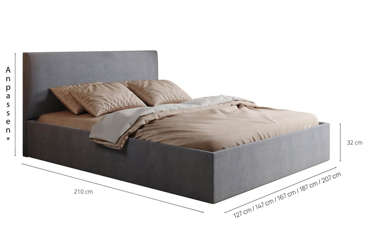 Interessiert Sie eine andere Farbe des Polsterstoffs oder möchten Sie weitere Details ändern? Bei MyBed können Sie jedes Bett ganz nach Belieben umgestalten und so einzigartige Kombinationen schaffen! Wir stellen Ihnen einen intuitiven Konfigurator zur Verfügung, mit dem Sie Ihre eigenen Ausstattungsoptionen und mehr festlegen können. Wählen Sie frei aus zahlreichen Schlafoberflächen, Farben und Texturen der Stoffe, Arten von Lattenrosten, dekorativen Füßen sowie der Höhe des Kopfteils. Sie entscheiden auch selbst, ob Sie ein Bett mit oder ohne Bettwäschebehälter wünschen. Sie können auch ein komplettes Bett inklusive Matratze bestellen!