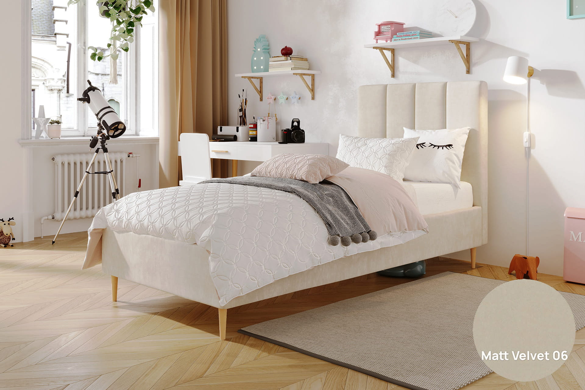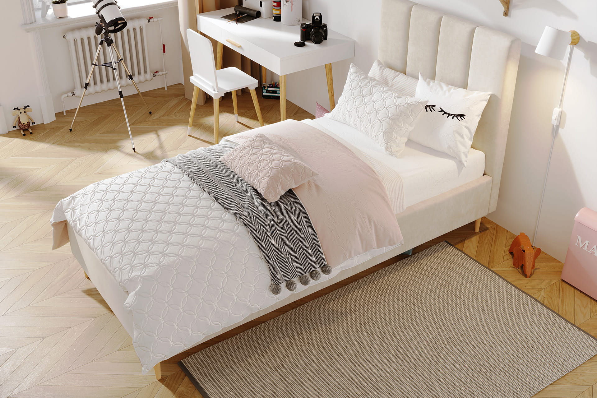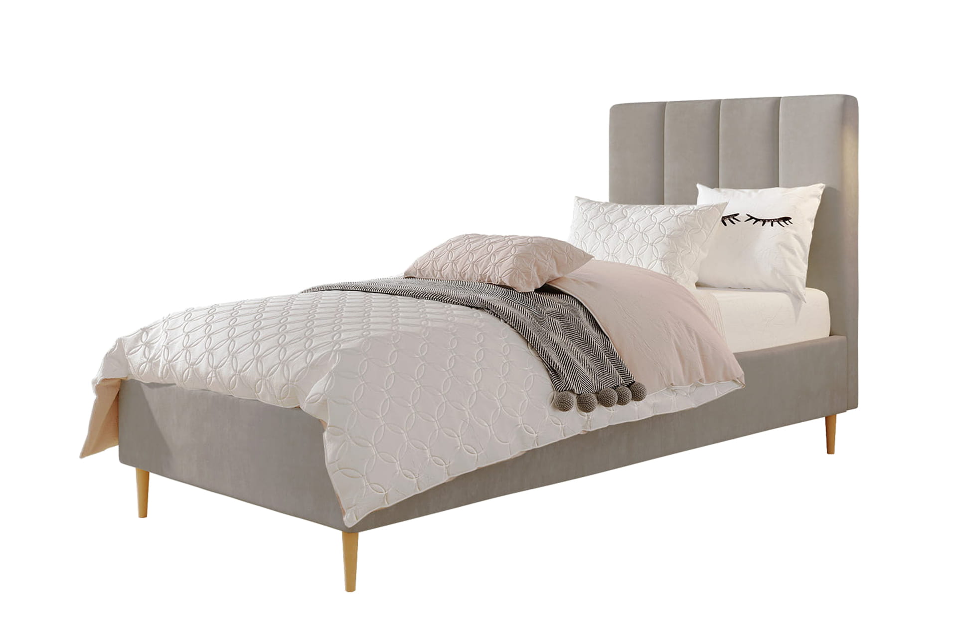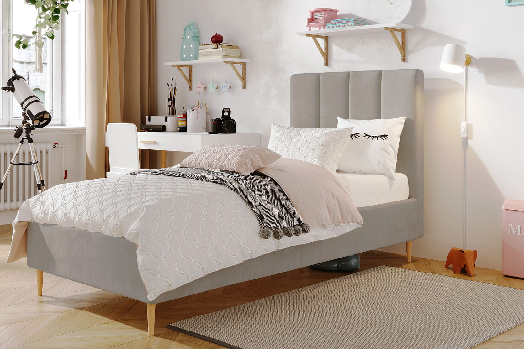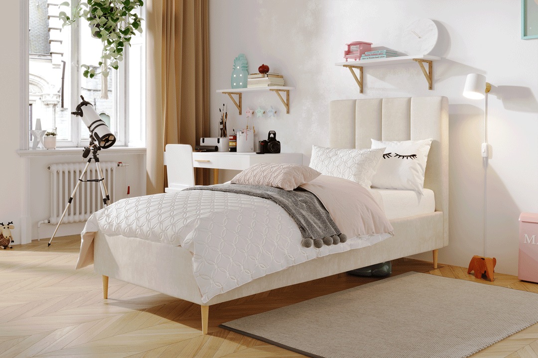 Jugendliche Eleganz in ihrer reinsten Form – so lässt sich das einzelne gepolsterte Bett Lola von MyBed beschreiben. Dieses klassische Modell auf dekorativen Beinen strahlt einen dezenten Charme aus, der jedes Kinderzimmer bereichert – und nicht nur das, sondern erleichtert auch die Reinigung Ihres Interieurs und eröffnet zuvor ungenutzten Stauraum. Das mit vertikalen Nähten verzierte Kopfteil verleiht Charakter und unterstreicht die Sorgfalt der Verarbeitung. Zudem garantiert die hohe Materialqualität Langlebigkeit und Komfort, und das recht universelle Design ermöglicht eine harmonische Anpassung an verschiedenste Raumgestaltungen. Komfort und Stil in einem? Lola ist die perfekte Wahl!