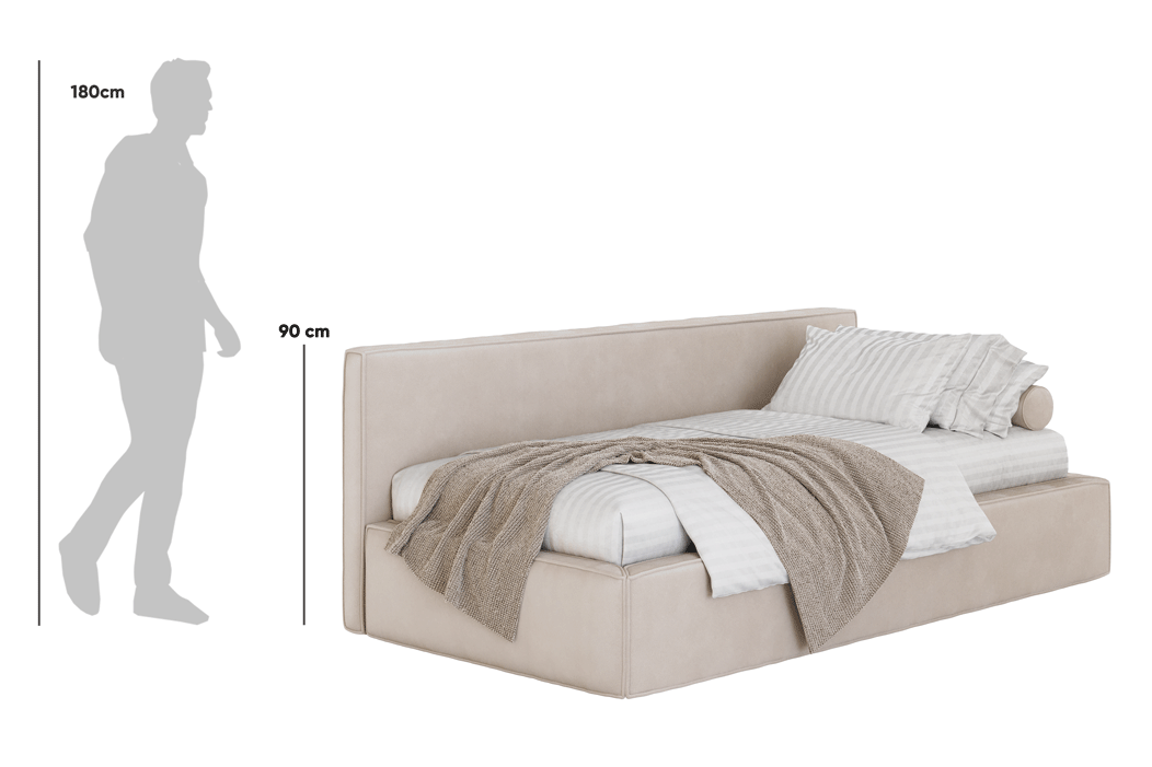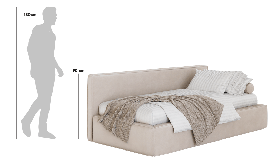 Möchten Sie Ihrem Schlafzimmer einen unverwechselbaren Charakter verleihen? Bett Mitto Solo von MyBed ist die ein-Personen-Version des bereits kultigen Mitto-Modells! Was zeichnet die Solo-Ausführung aus? Das Kopfteil ist an der längeren Seite angebracht, was eine kreative Anordnung des Bettes im Raum und eine optimale Raumnutzung ermöglicht. Die glatte Oberfläche und die sorgfältig ausgeführten Nähte betonen die Eleganz des Möbelstücks und schaffen ein harmonisches Gesamtbild. Dadurch ist das Mitto Solo die ideale Lösung für alle, die Schlafkomfort in Kombination mit außergewöhnlichem Design wünschen.