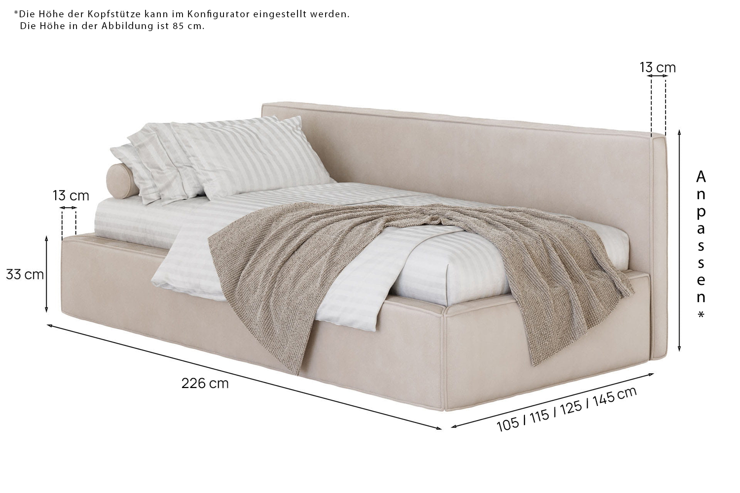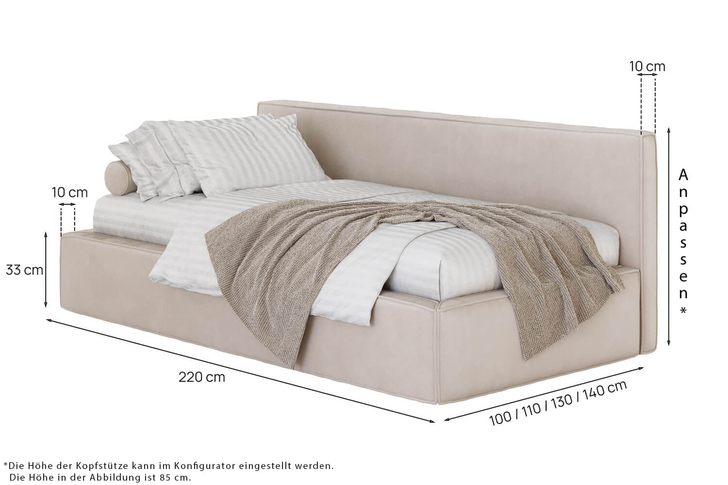 Die angezeigten Maße können Sie ändern, indem Sie im Konfigurator eine andere Schlafoberfläche wählen