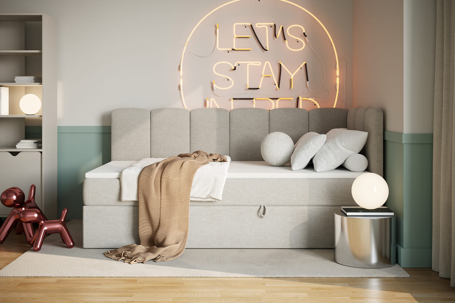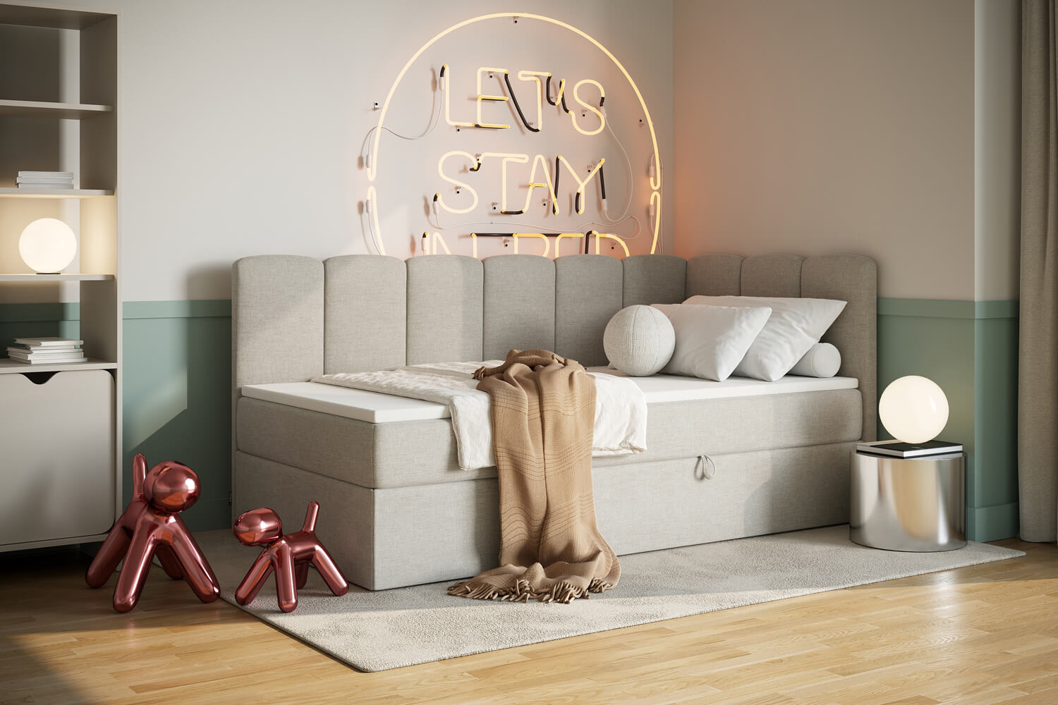 Nilo Conti von MyBed ist ein Einzel-Boxspringbett, das mit schlichter Eleganz begeistert und dich gleichzeitig von zwei Seiten umhüllt – dank eines gepolsterten Kopfteils aus vertikalen Paneelen, das an der langen und an der kurzen Bettseite angebracht ist. Die weiche Form mit sanft abgerundeten Kanten verleiht dem Gesamtbild subtile Leichtigkeit, während der Verzicht auf zusätzliche Verzierungen einen harmonischen, minimalistischen Look schafft, der perfekt zu modernen Interieurs passt. Sorgfältig ausgewählte Materialien garantieren Langlebigkeit, und die komfortable Boxspring-Konstruktion bietet höchsten Liegekomfort. Noli Conti wird schnell zu deinem Lieblingsmöbelstück!
