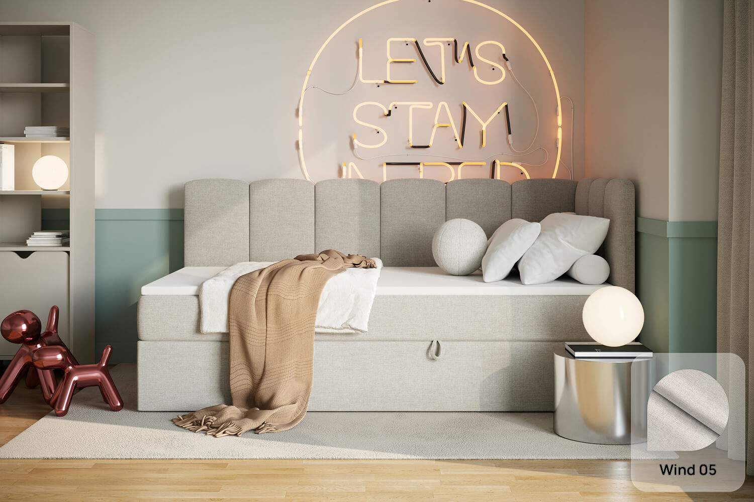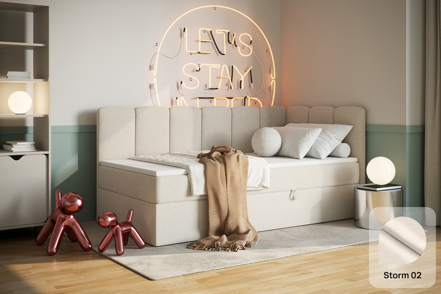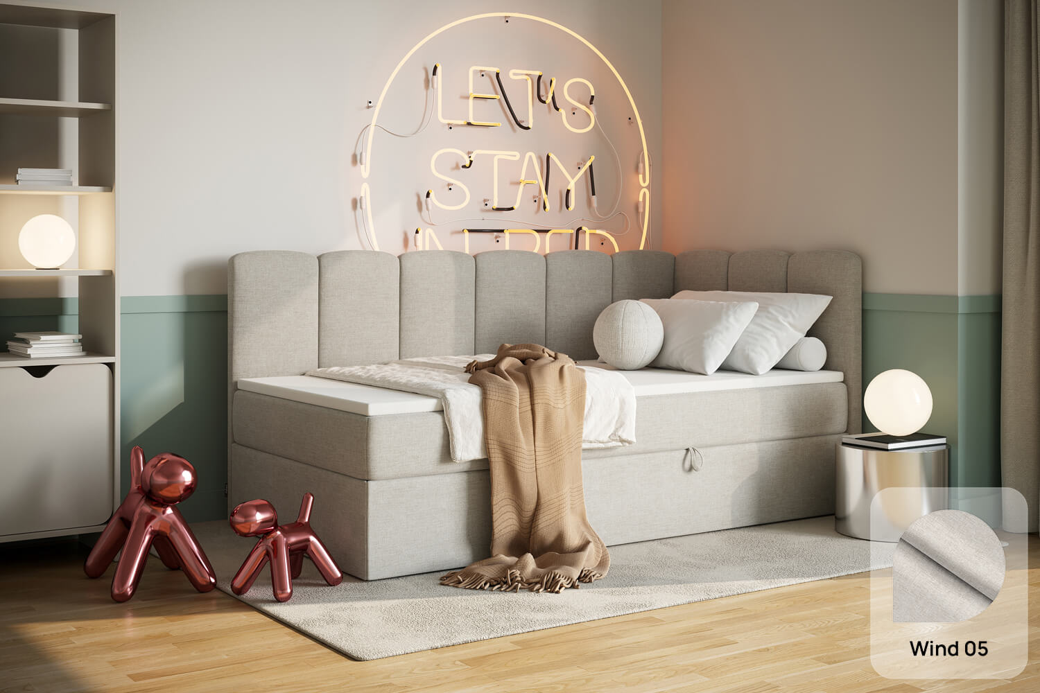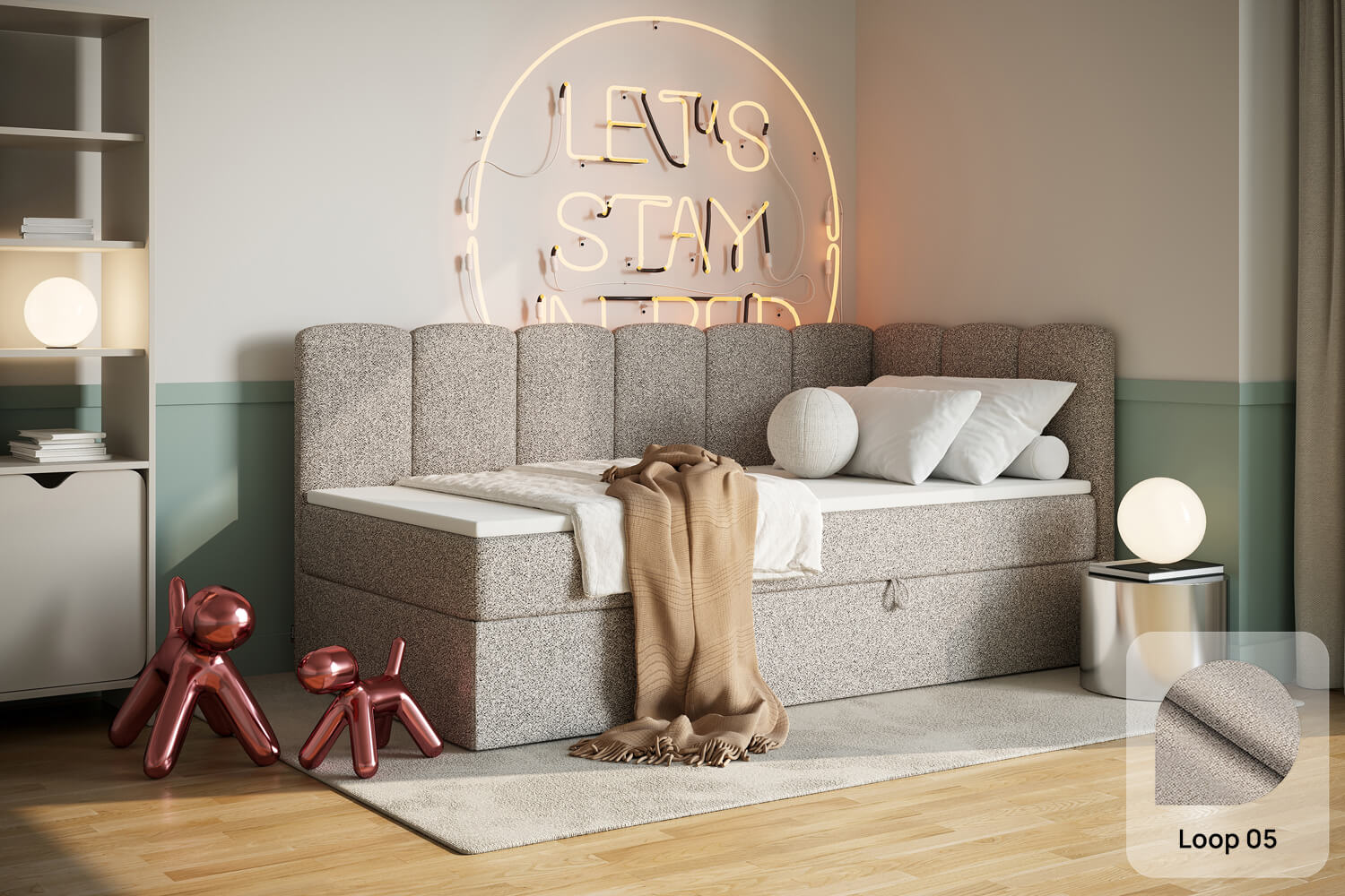 Unsere Bezugsstoffe vereinen Stil und Robustheit. Sie sind abriebfest, pflegeleicht und in zahlreichen Farben sowie Strukturen erhältlich, damit du das Bett perfekt an dein Interieur anpassen kannst.