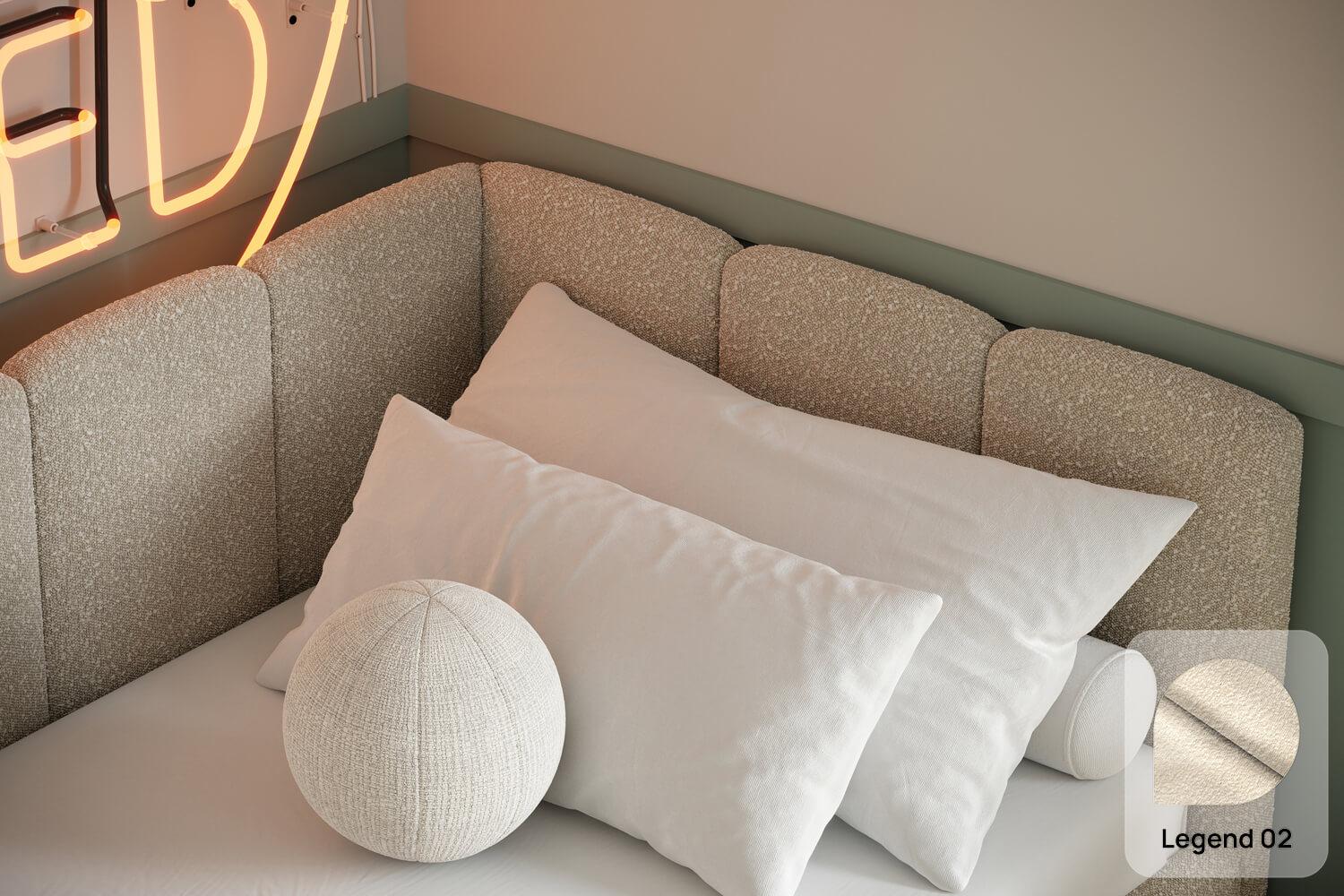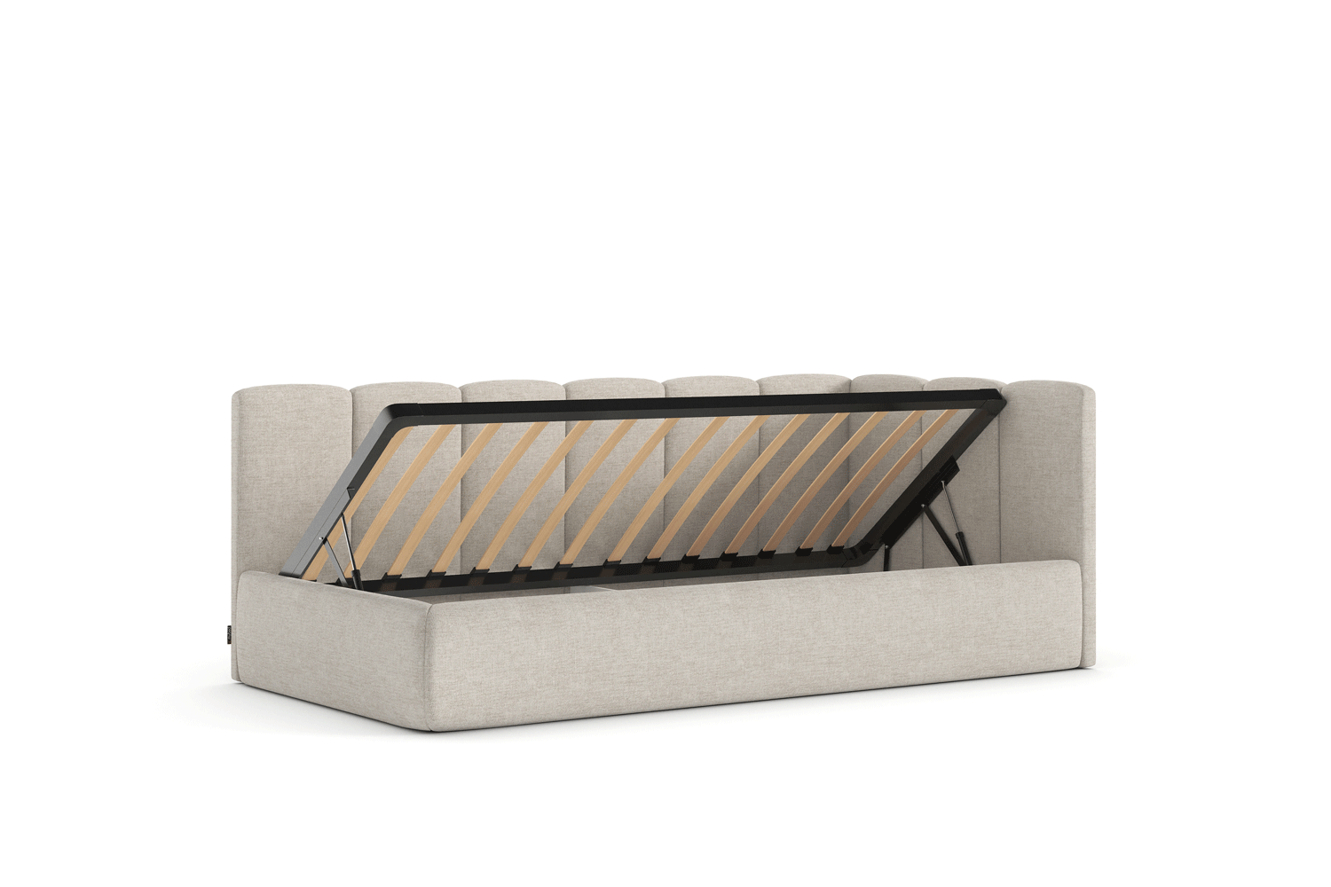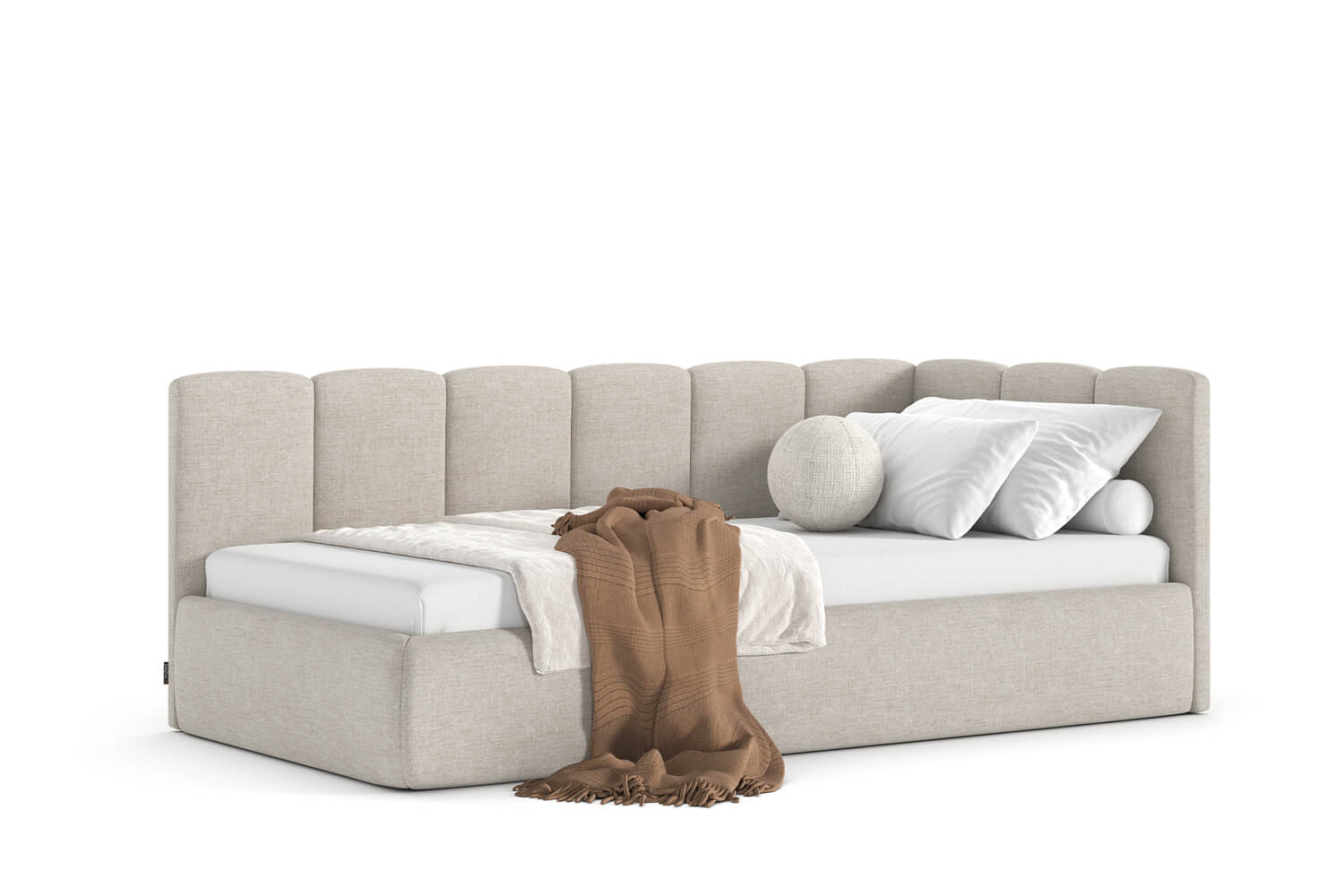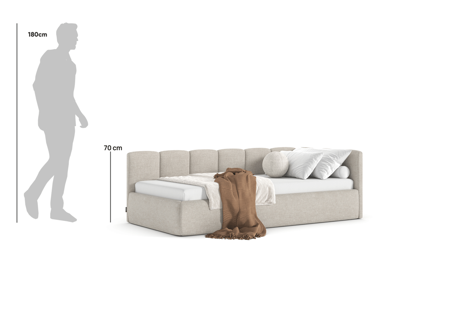 Das außergewöhnliche Design des gepolsterten Bettes Nilo von MyBed wird durch zwei gepolsterte Kopfteile aus vertikalen, weichen Paneelen geprägt – eines an der kurzen, das andere an der langen Seite. Ihre abgerundeten Kanten verleihen dem Gesamtbild einen sanften, gemütlichen Charakter. Darüber hinaus betonen die runde Form und die glatten Bettseiten den minimalistischen Stil des Bettes und ermöglichen eine einfache Anpassung an unterschiedlichste Einrichtungsstile. Dank der Möglichkeit, es in einer Ecke aufzustellen, nutzt du den Raum in kleineren Zimmern optimal und schaffst gleichzeitig eine behagliche Ruhezone. Wähle Nilo und gestalte deinen idealen Entspannungsort – genau so, wie du es magst!