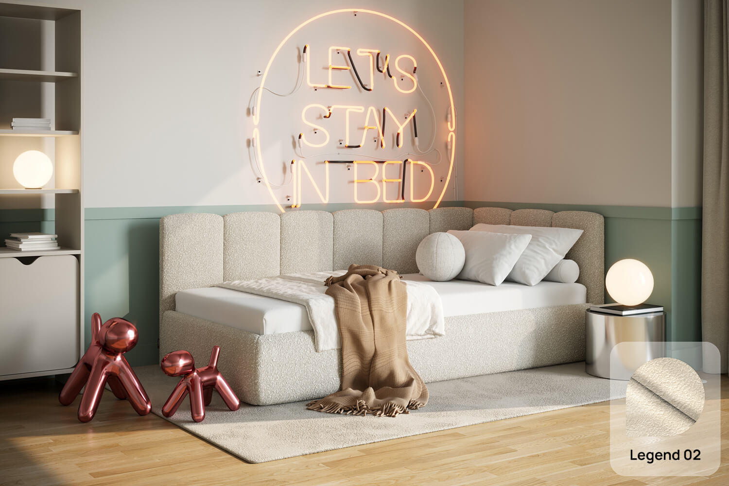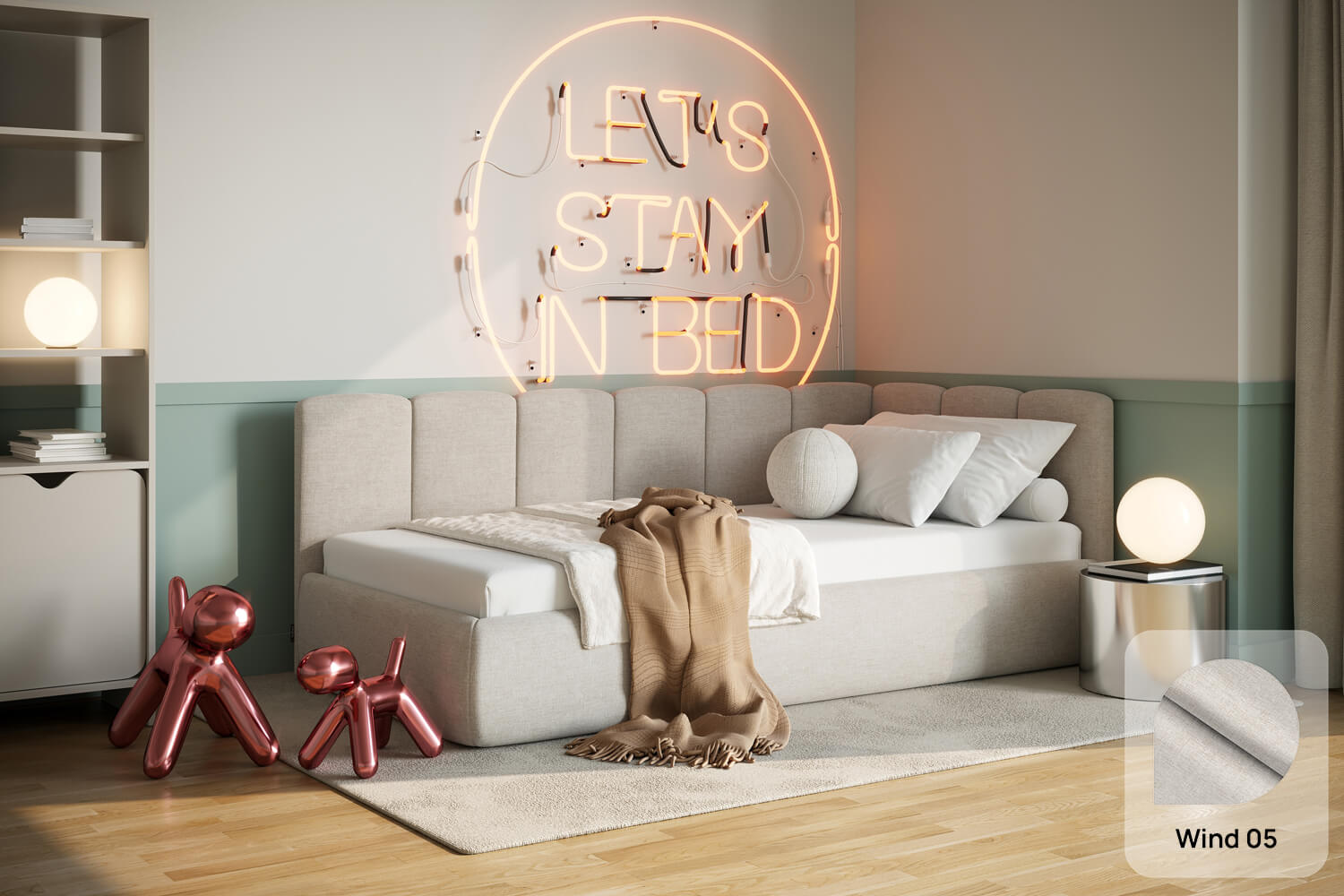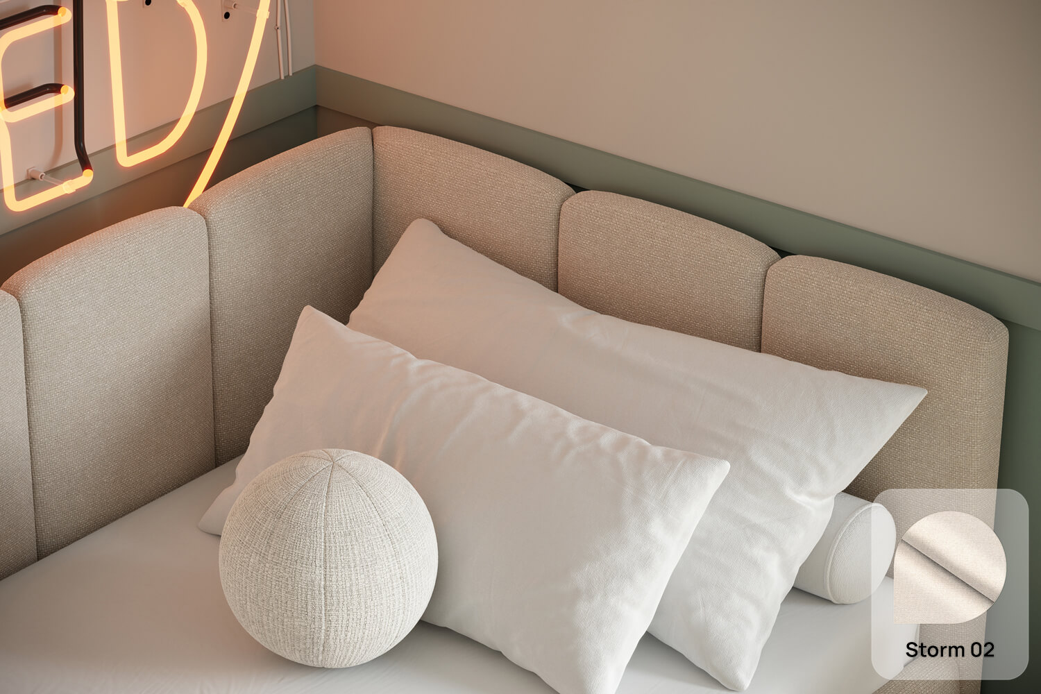 Das außergewöhnliche Design des gepolsterten Bettes Nilo von MyBed wird durch zwei gepolsterte Kopfteile aus vertikalen, weichen Paneelen geprägt – eines an der kurzen, das andere an der langen Seite. Ihre abgerundeten Kanten verleihen dem Gesamtbild einen sanften, gemütlichen Charakter. Darüber hinaus betonen die runde Form und die glatten Bettseiten den minimalistischen Stil des Bettes und ermöglichen eine einfache Anpassung an unterschiedlichste Einrichtungsstile. Dank der Möglichkeit, es in einer Ecke aufzustellen, nutzt du den Raum in kleineren Zimmern optimal und schaffst gleichzeitig eine behagliche Ruhezone. Wähle Nilo und gestalte deinen idealen Entspannungsort – genau so, wie du es magst!