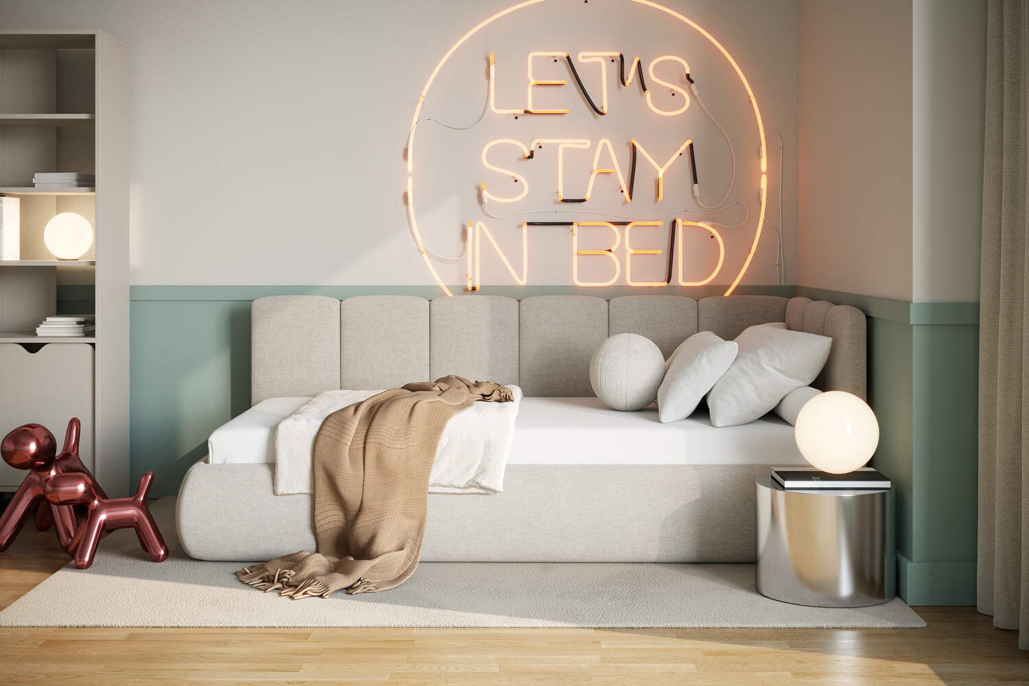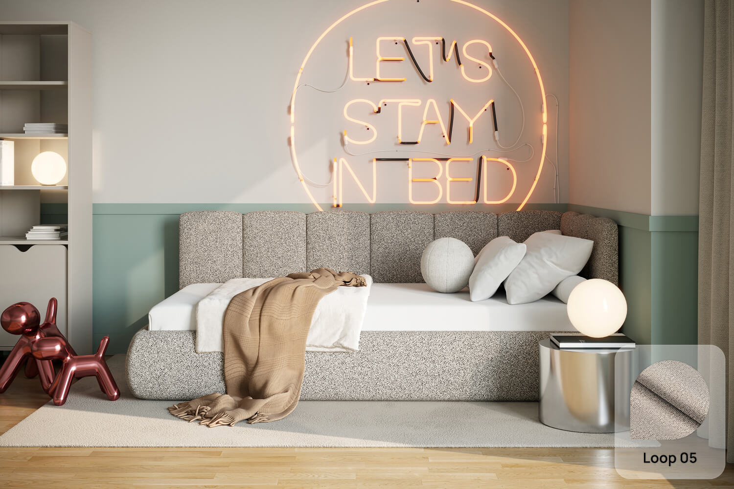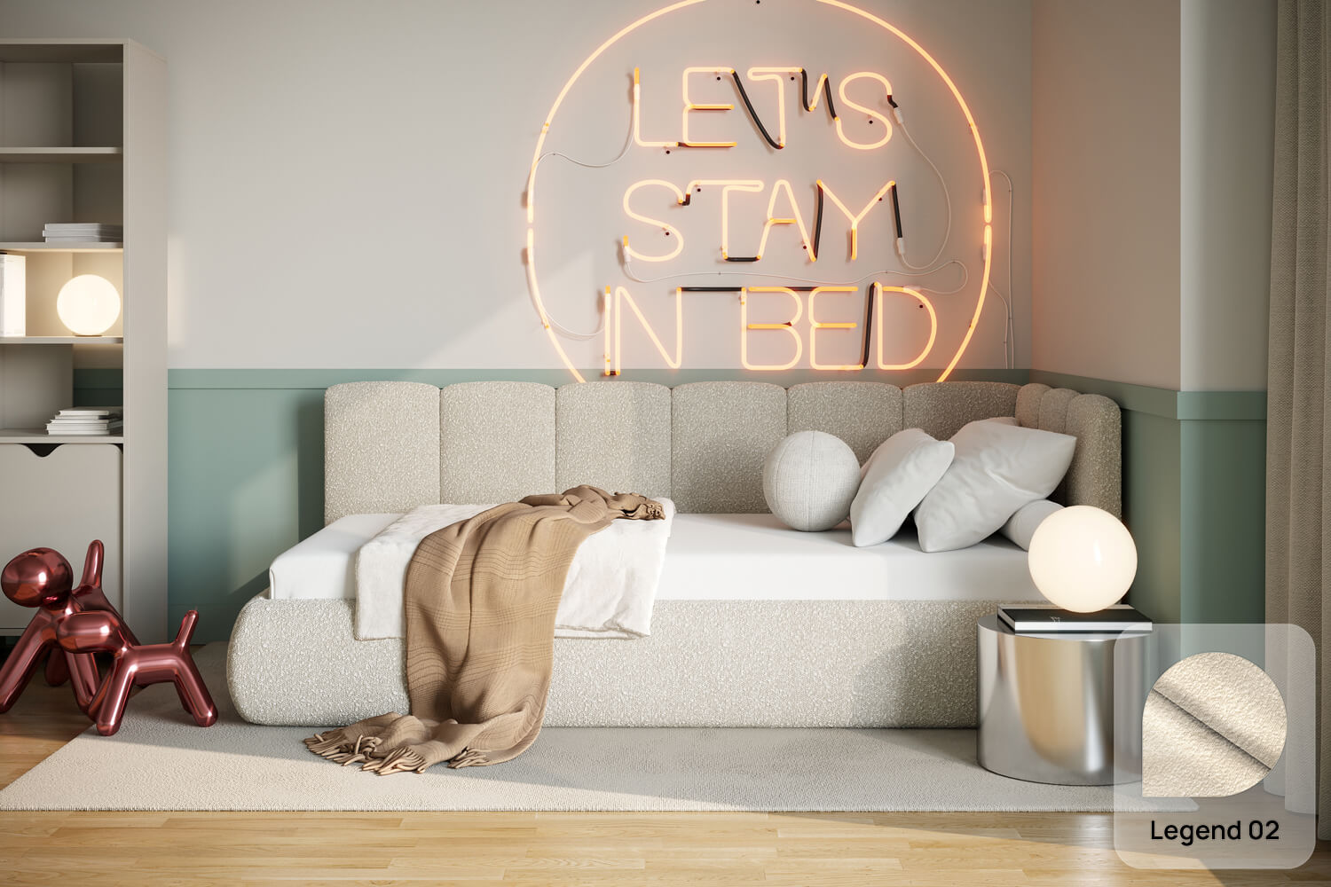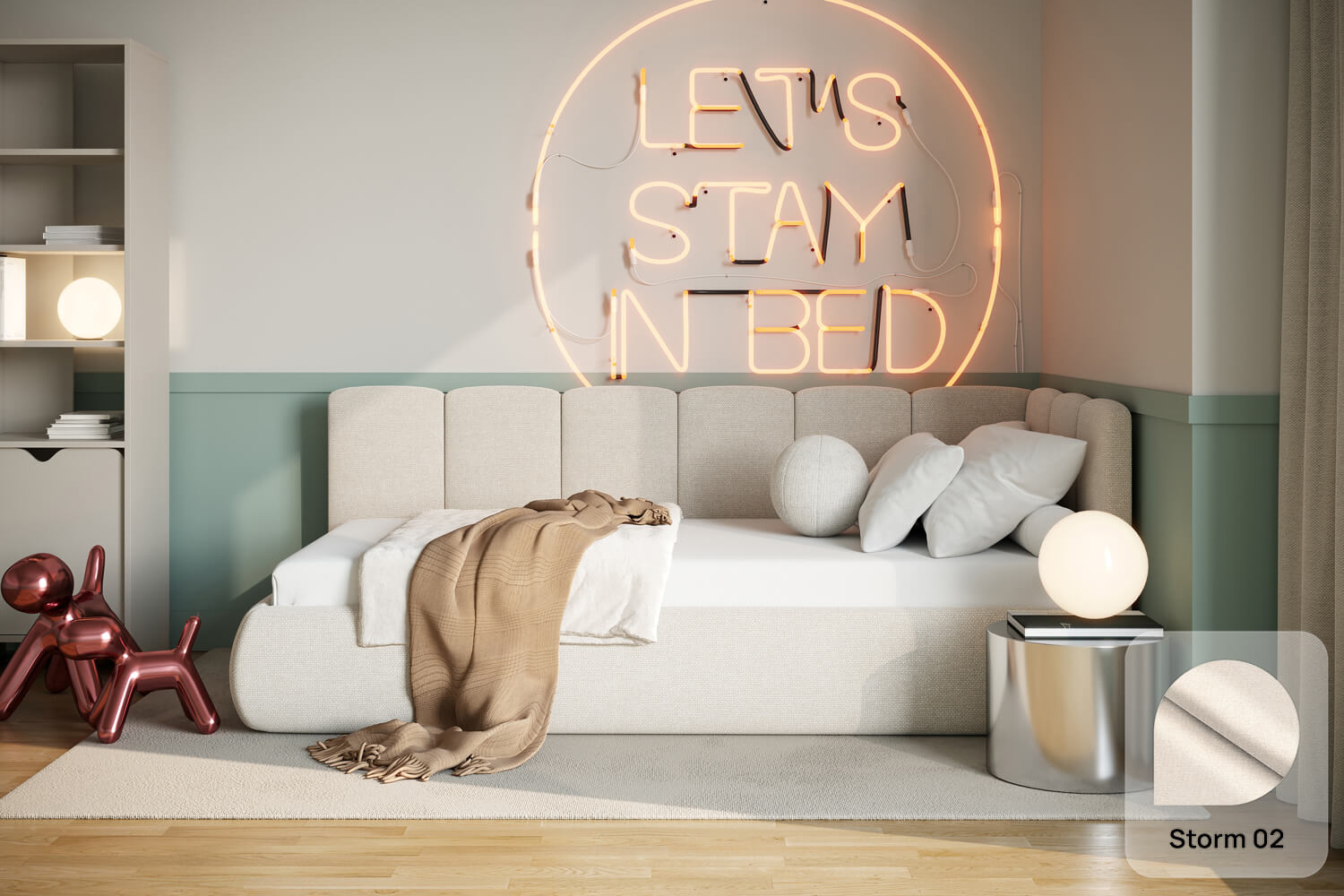 Das außergewöhnliche Design des gepolsterten Bettes Nilo von MyBed wird durch zwei gepolsterte Kopfteile aus vertikalen, weichen Paneelen geprägt – eines an der kurzen, das andere an der langen Seite. Ihre abgerundeten Kanten verleihen dem Gesamtbild einen sanften, gemütlichen Charakter. Darüber hinaus betonen die runde Form und die glatten Bettseiten den minimalistischen Stil des Bettes und ermöglichen eine einfache Anpassung an unterschiedlichste Einrichtungsstile. Dank der Möglichkeit, es in einer Ecke aufzustellen, nutzt du den Raum in kleineren Zimmern optimal und schaffst gleichzeitig eine behagliche Ruhezone. Wähle Nilo und gestalte deinen idealen Entspannungsort – genau so, wie du es magst!