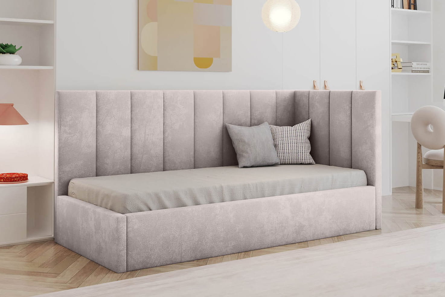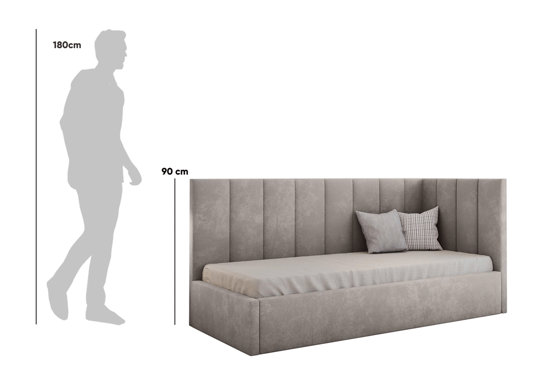 Das gepolsterte Einzelbett Silla 2 von MyBed ist die ideale Lösung für Liebhaber von Funktionalität und modernem Design! Das einzigartige Kopfteil, das an beiden Seiten – der längeren und der kürzeren – angebracht ist, schafft eine gemütliche Ecke, die zum Entspannen und Erholen einlädt. Darüber hinaus wurde es mit vertikalen, paneelartigen Nähten verziert, die subtile Dynamik verleihen und den einzigartigen Charakter des Möbelstücks unterstreichen. Dadurch bietet das Bett Silla 2 nicht nur einen komfortablen Schlaf, sondern wird auch zu einer stilvollen Dekoration in Ihrem Schlafzimmer. Investieren Sie in die Kombination von Ästhetik und Praktikabilität!
