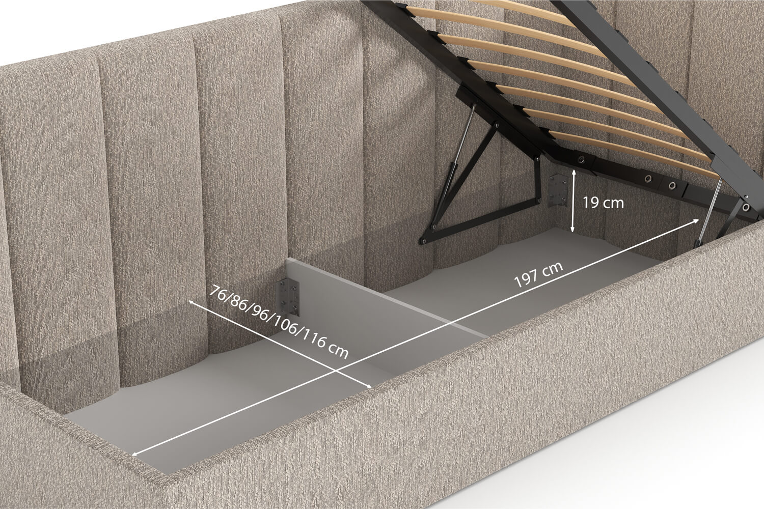 Der funktionale Stauraum für Bettwäsche in unseren Betten bietet zusätzlichen Platz zur Aufbewahrung. Ideal zum Verstauen von Bettwäsche, Kissen und anderen Gegenständen, hilft er, Ordnung im Schlafzimmer zu halten. Hergestellt aus robusten Materialien, ist er leicht zu bedienen und gewährleistet hohen Komfort.
