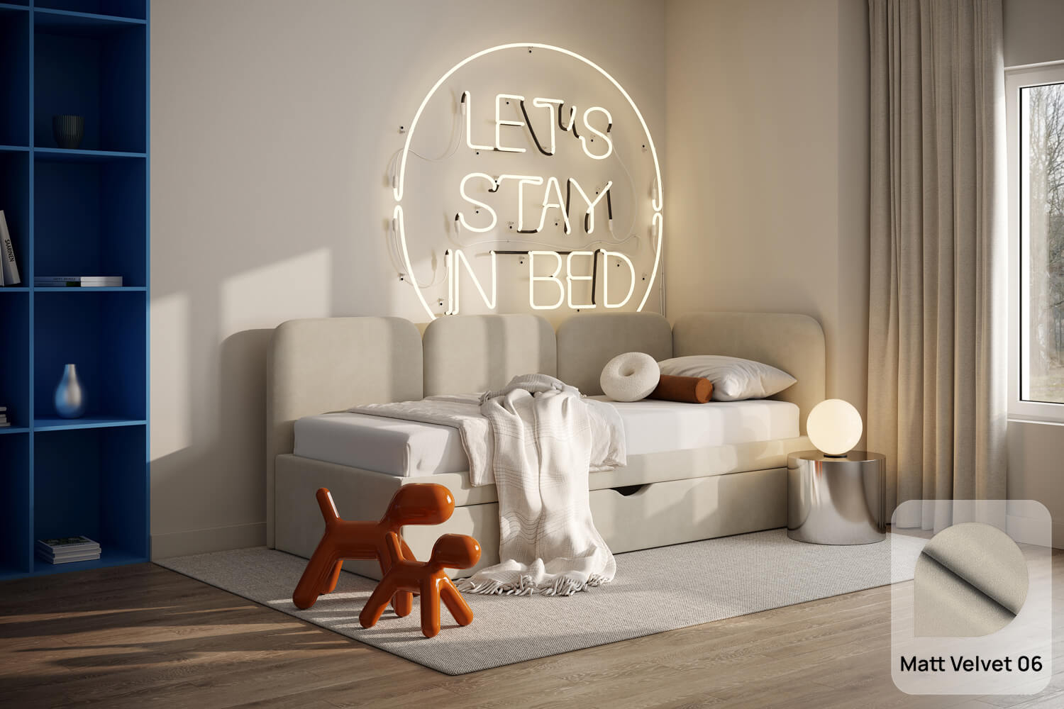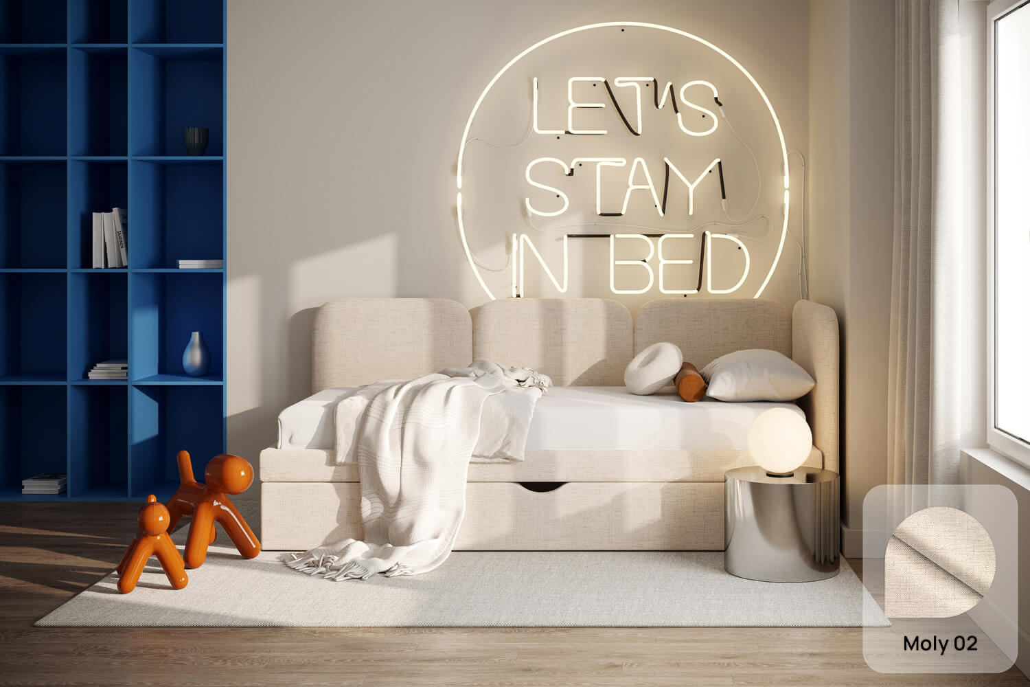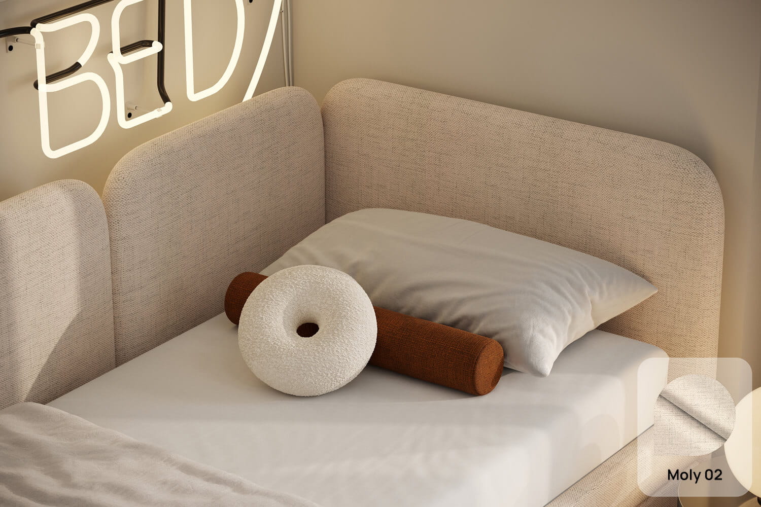 Das einzigartige Design des gepolsterten Bettes Toni von MyBed besteht aus vier glatten Kopfteilen – eines an der kurzen Seite und drei an der langen. Ihre abgerundeten Ecken verleihen dem Schlafzimmer eine sanfte und gemütliche Note. Darüber hinaus betonen die glatten Seiten der Rahmen den minimalistischen Stil des Bettes und ermöglichen eine einfache Anpassung an verschiedene Raumgestaltungen. Dank der Möglichkeit, es in einer Ecke zu platzieren, nutzen Sie den Raum in kleineren Zimmern optimal aus und schaffen gleichzeitig eine gemütliche Ecke zur Entspannung. Wählen Sie Toni und gestalten Sie Ihr eigenes perfektes Ruheparadies – genau so, wie Sie es mögen!