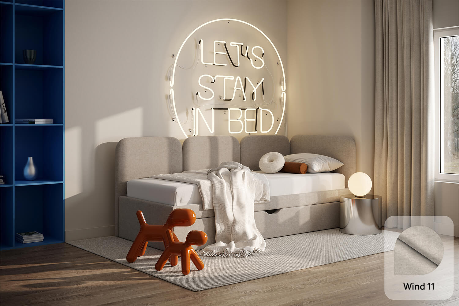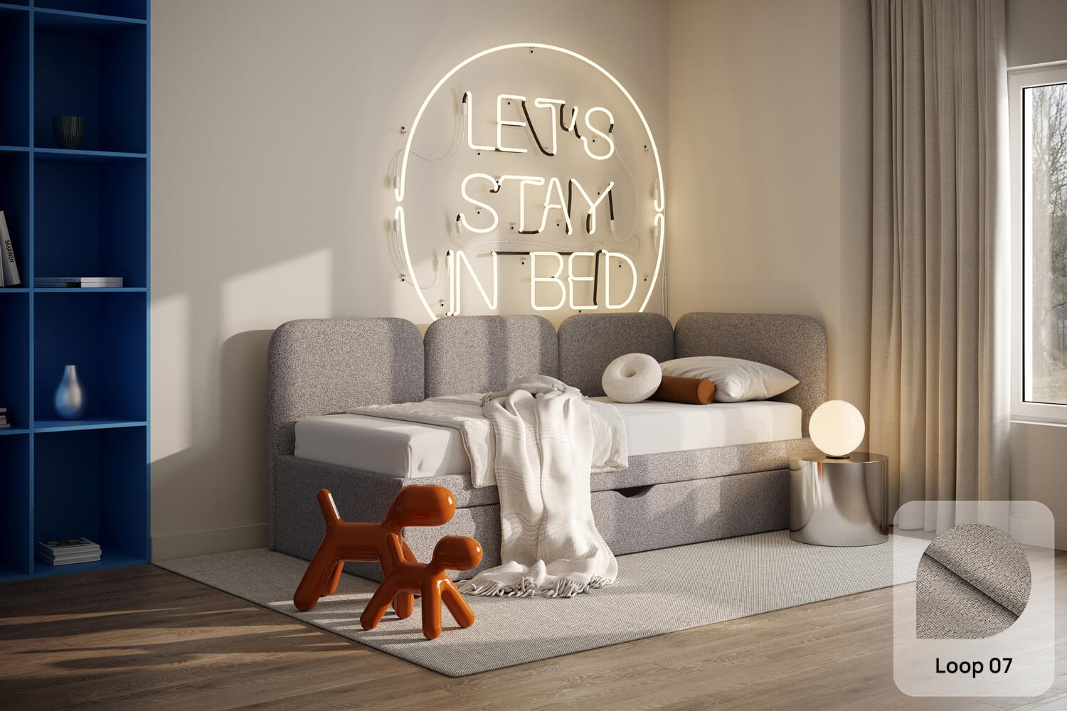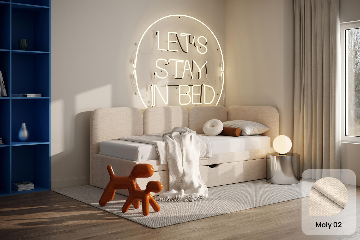 Das einzigartige Design des gepolsterten Bettes Toni von MyBed besteht aus vier glatten Kopfteilen – eines an der kurzen Seite und drei an der langen. Ihre abgerundeten Ecken verleihen dem Schlafzimmer eine sanfte und gemütliche Note. Darüber hinaus betonen die glatten Seiten der Rahmen den minimalistischen Stil des Bettes und ermöglichen eine einfache Anpassung an verschiedene Raumgestaltungen. Dank der Möglichkeit, es in einer Ecke zu platzieren, nutzen Sie den Raum in kleineren Zimmern optimal aus und schaffen gleichzeitig eine gemütliche Ecke zur Entspannung. Wählen Sie Toni und gestalten Sie Ihr eigenes perfektes Ruheparadies – genau so, wie Sie es mögen!