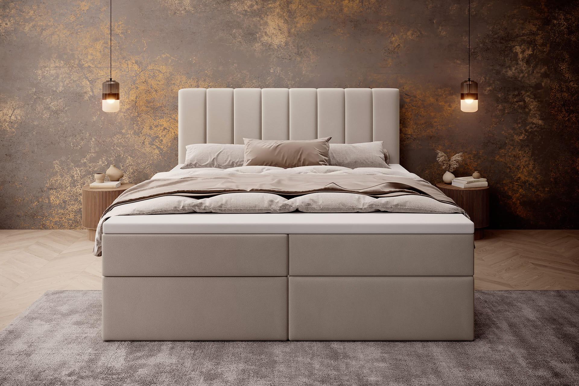 Außergewöhnlicher Komfort und moderne Eleganz sind die Schlüsselfaktoren, die das Allen-Modell von MyBed definieren. Ein hoher, weich gepolsterter Kopfteil zieht nicht nur die Blicke auf sich, sondern bietet auch Komfort beim Entspannen. Die solide, mehrschichtige kontinentale Konstruktion, bestehend aus mehreren Matratzenebenen, bietet außergewöhnliche Unterstützung und macht jeden Schlaf regenerierend. Dieses Bett bringt einen Hauch von Hotel-Luxus ins Schlafzimmer, indem es Stil und Funktionalität vereint – die ideale Wahl für alle, die von außergewöhnlicher Erholung im heimischen Rückzugsort träumen.