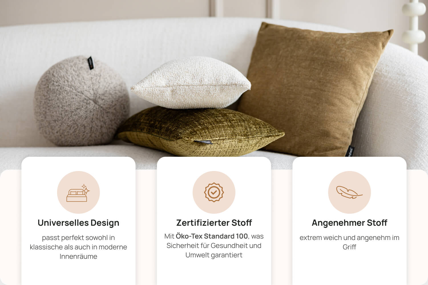 Unser Ziel war es, eine Kollektion einzigartiger Dekorationsartikel zu schaffen. Wir möchten, dass unsere Produkte Ihr Interieur perfekt ergänzen, deshalb bieten wir eine Vielzahl von Kissen und Kissenbezügen an, die Ihren Bedürfnissen entsprechen. Mit einer großen Auswahl an Mustern und Texturen verleihen unsere Kissen jedem Raum einen einzigartigen Charakter und Komfort. Die verwendeten Materialien stammen aus nachhaltiger Produktion und garantieren Schönheit und Verantwortung für die Umwelt.