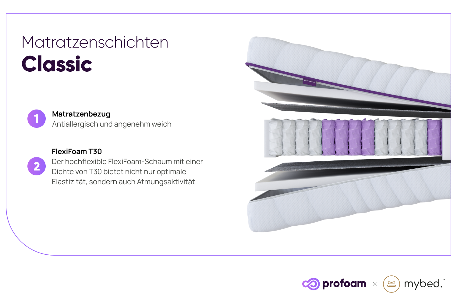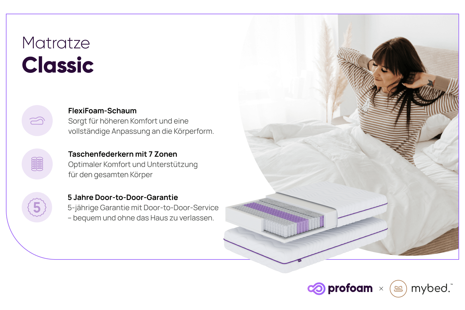 „Wir empfehlen den Shop sehr! Das Bett wurde vor dem geplanten Liefertermin geliefert, also schnell. Das Bett selbst ist sehr solide gebaut...”Vorteile der Profoam-Matratze