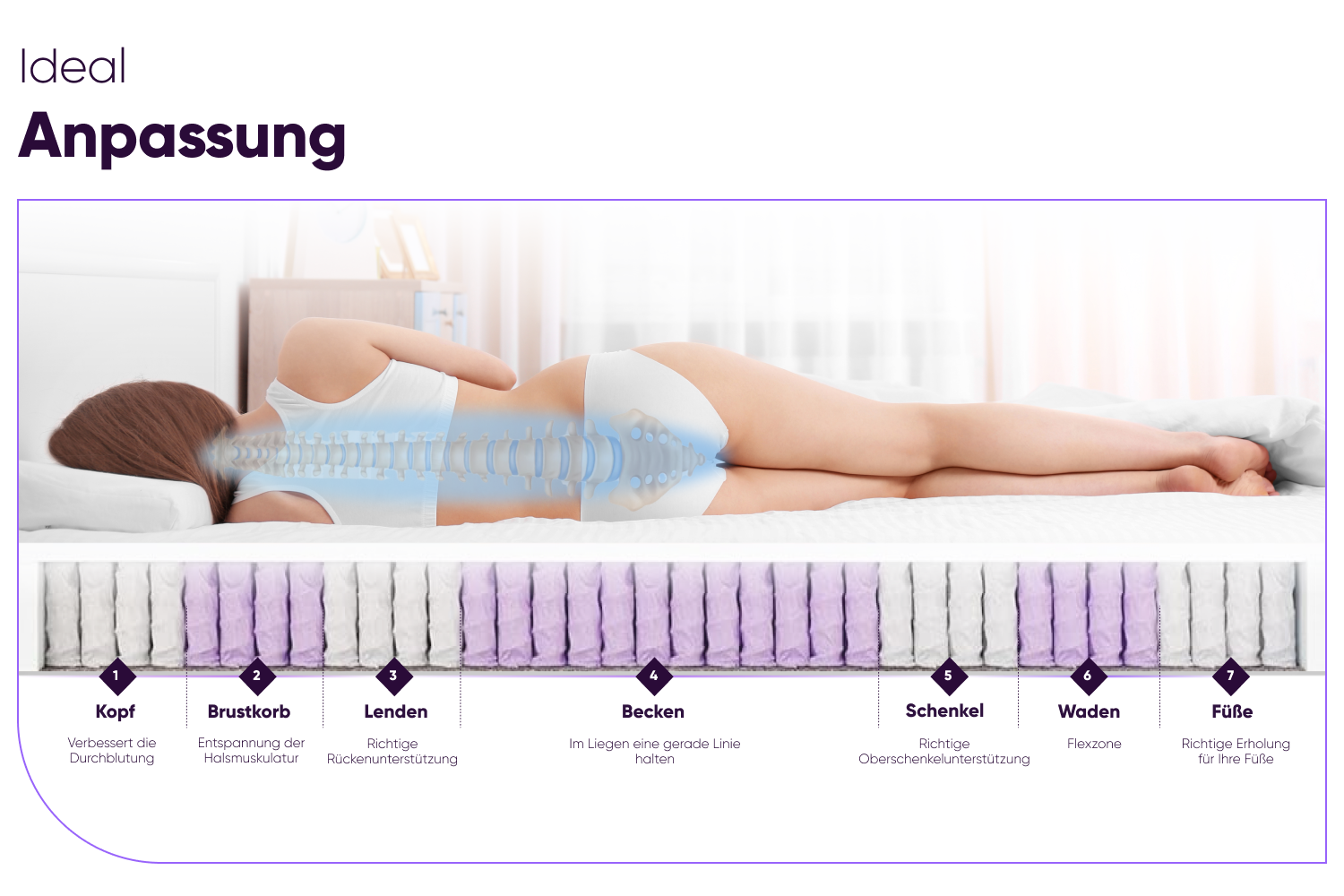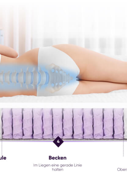 Um den Komfort des Benutzers noch weiter zu steigern, wurden spezielle Einsätze mit 7 verschiedenen Härtegradbereichen auf den Federn angebracht, die die Elastizität der Matratze in den jeweiligen Druckzonen optimieren.