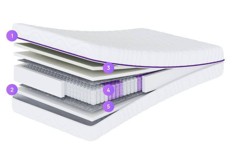Ein hochflexibler Schaum mit einer Dichte von T30 sorgt für die gewünschte Elastizität über die gesamte Oberfläche der Matratze. Er dient auch als Verstärkungsschicht für die Taschenfedern, die das Kernstück der Matratze bilden.