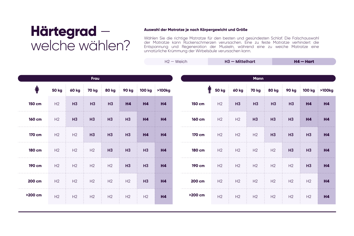 Die Wahl der Matratzenhärte hängt von den Vorlieben und dem Körpergewicht ab. Weiche Matratzen eignen sich ideal für leichtere Personen oder für diejenigen, die ein tieferes Einsinken und Behaglichkeit bevorzugen. Mittelfeste Matratzen bieten eine Balance zwischen Unterstützung und Komfort und sind für die meisten Nutzer geeignet. Für Personen mit höherem Gewicht oder solche, die eine stabile Unterstützung bevorzugen, sind harte Matratzen ideal, da sie eine solide Unterstützung der Wirbelsäule gewährleisten.