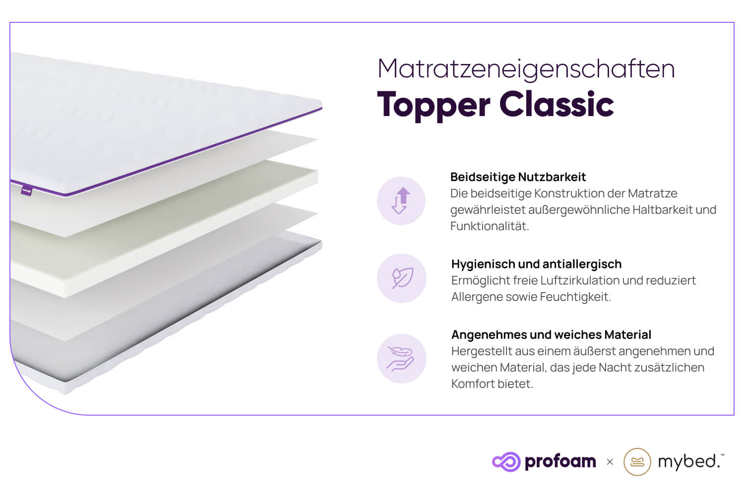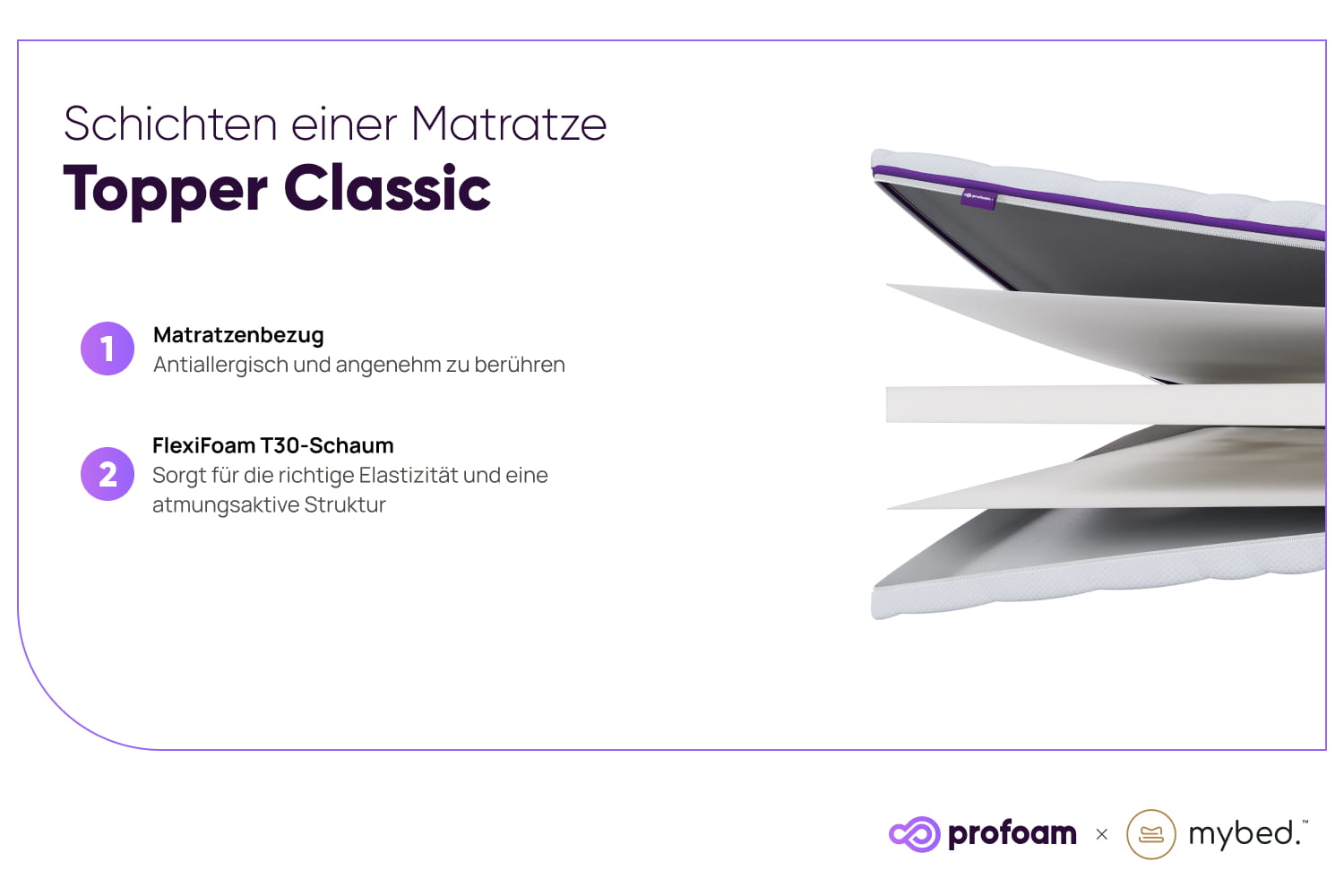 Vergessen Sie schlaflose Nächte! Hier ist der äußerst durchdachte Topper Classic von der renommierten Marke Profoam, der mit dem Ziel entwickelt wurde, maximalen Schlafkomfort bei gleichzeitig konstantem Luftstrom zu gewährleisten. Hochwertige Materialien und mehrere unabhängige Füllschichten garantieren eine perfekte Entlastung des Körpers über die gesamte Länge.