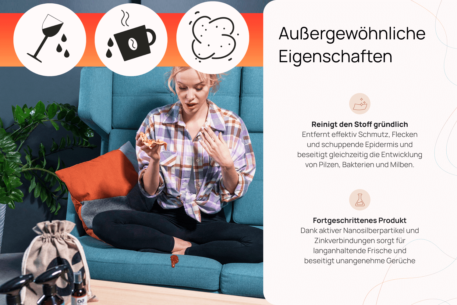 OA SOFA CARE ist ein fortgeschrittenes, ökologisches Polsterreinigungsprodukt, das Schmutz, Flecken und schuppende Epidermis entfernt und gleichzeitig Pilze, Bakterien und Milben beseitigt. Dank aktiver Nanosilberpartikel und Zinkverbindungen sorgt es für langanhaltende Frische und beseitigt unangenehme Gerüche. Das Produkt ist sicher für gereinigte Oberflächen, biologisch abbaubar und dermatologisch getestet. Das Produkt basiert auf Inhaltsstoffen aus nachhaltigem Anbau. Seine innovative Formel hält das Polstermaterial sauber und hygienisch und reduziert die Anziehung von Schmutz und Staub.