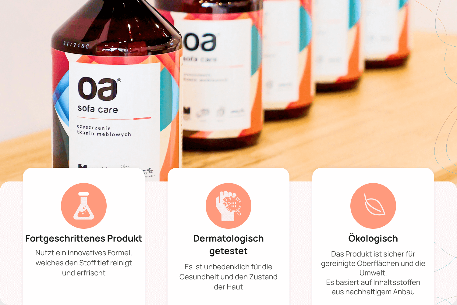 Die Auswahl einer Basis von Produkten zur Reinigung und Auffrischung Ihrer Innenräume - das war unsere Aufgabe. Wir wollen Ihre Polstermöbel bestmöglich pflegen und stellen Ihnen deshalb die OA-Reinigungsprodukte vor. Das OA-Sortiment an Reinigungsprodukten bietet eine hochwertige Reinigung und hinterlässt dank fortschrittlicher Technologie eine erstaunliche Frische. Die Inhaltsstoffe der OA-Produkte stammen aus nachhaltigem Anbau und haben keine negativen Auswirkungen auf die Umwelt.
