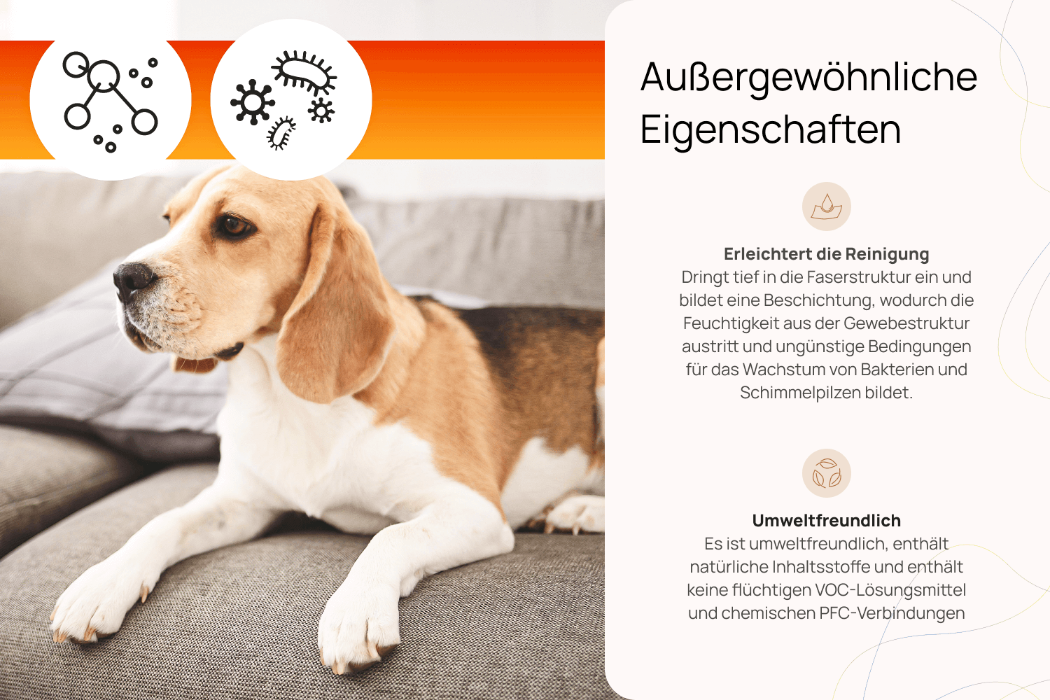 Ein hervorragendes Produkt zum Schutz von Polstermöbeln vor unerwünschten Flecken und Verschmutzungen, das im Einklang mit der natürlichen Umwelt entwickelt wurde. Die Inhaltsstoffe des Produkts sind biologisch abbaubar und frei von synthetischen und erdölbasierten Substanzen.